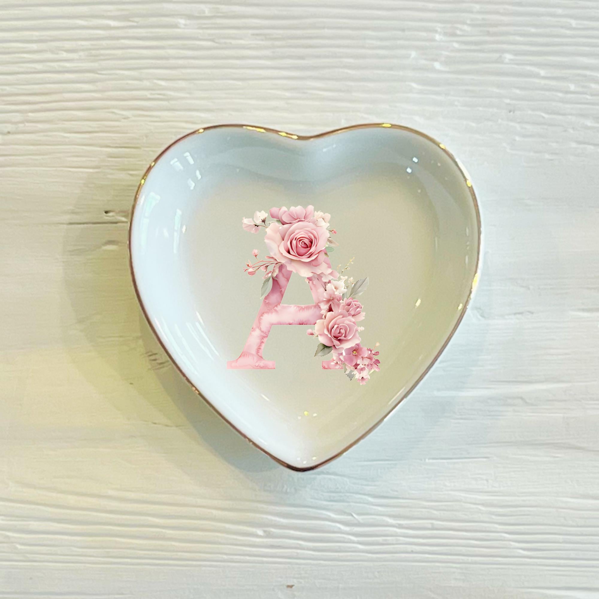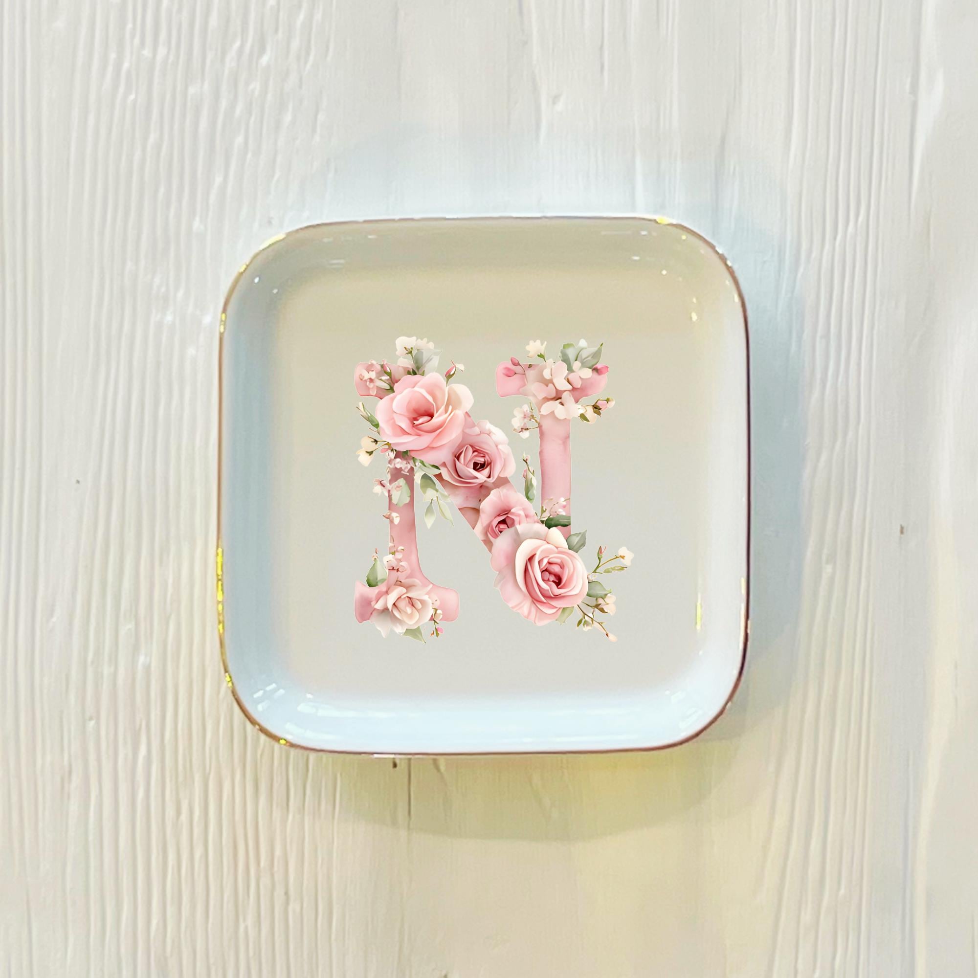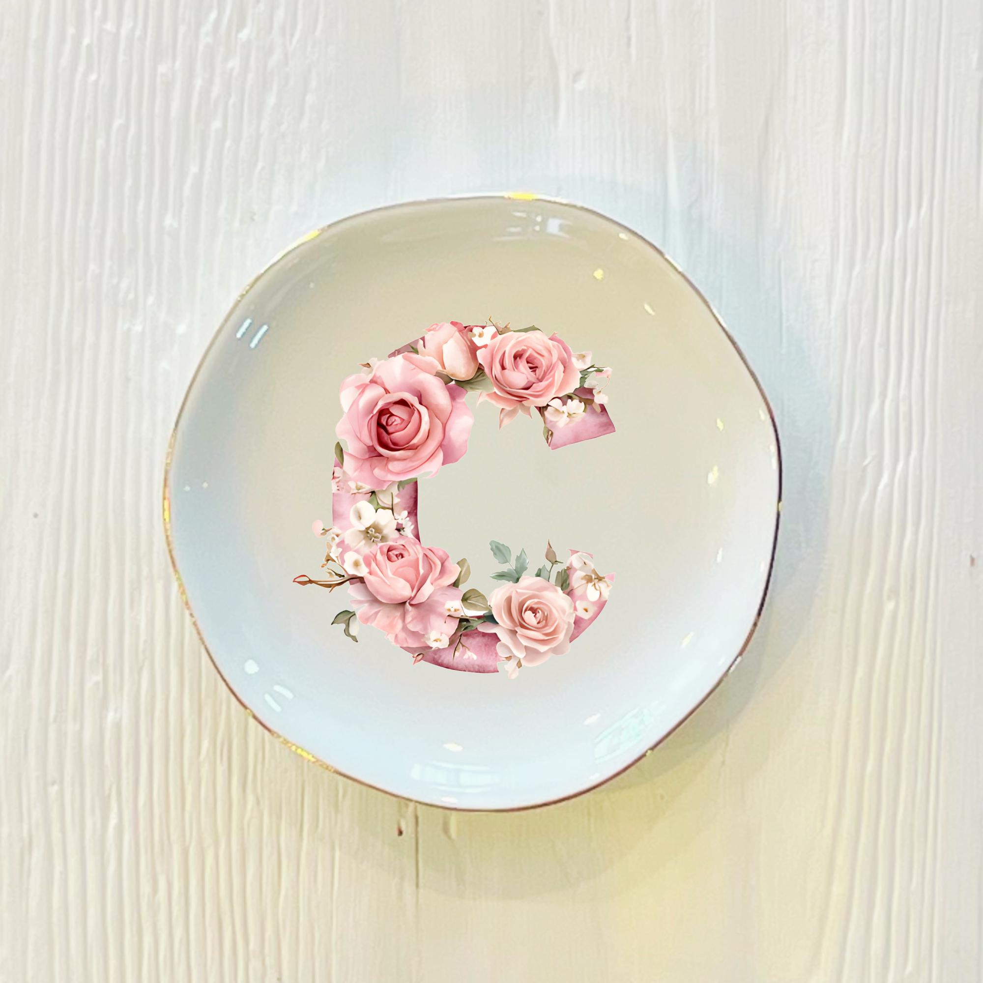 Personalized Pink Rose Initial Ring Dish: Custom Ceramic Trinket Holder