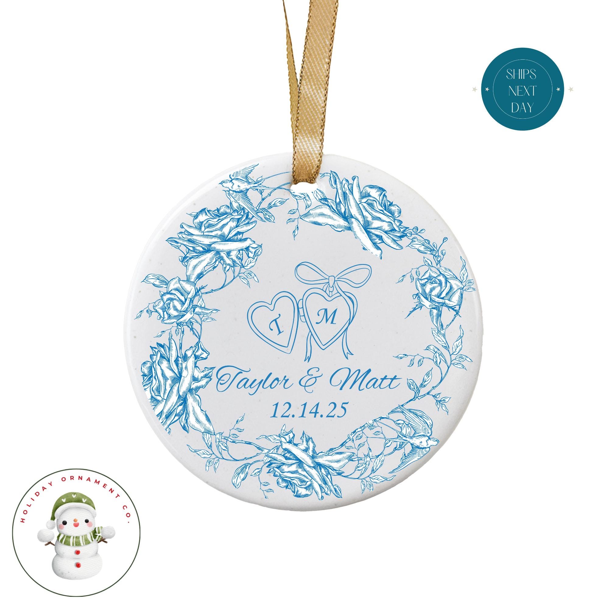 Personalized Blue Toile Couples Ornament: Custom Ceramic Christmas Ornament Gift