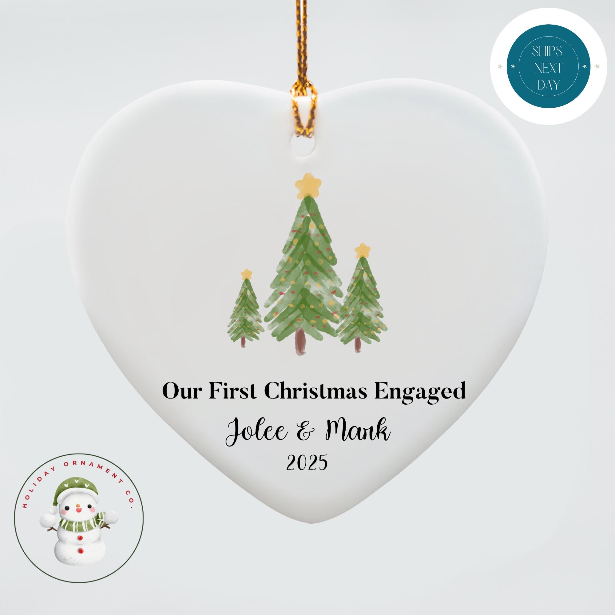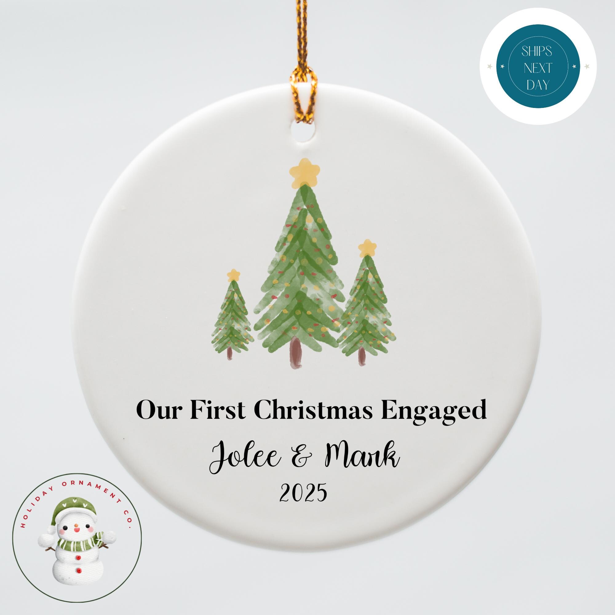 First Christmas Engaged Ornament: Watercolor Tree Ceramic Keepsake