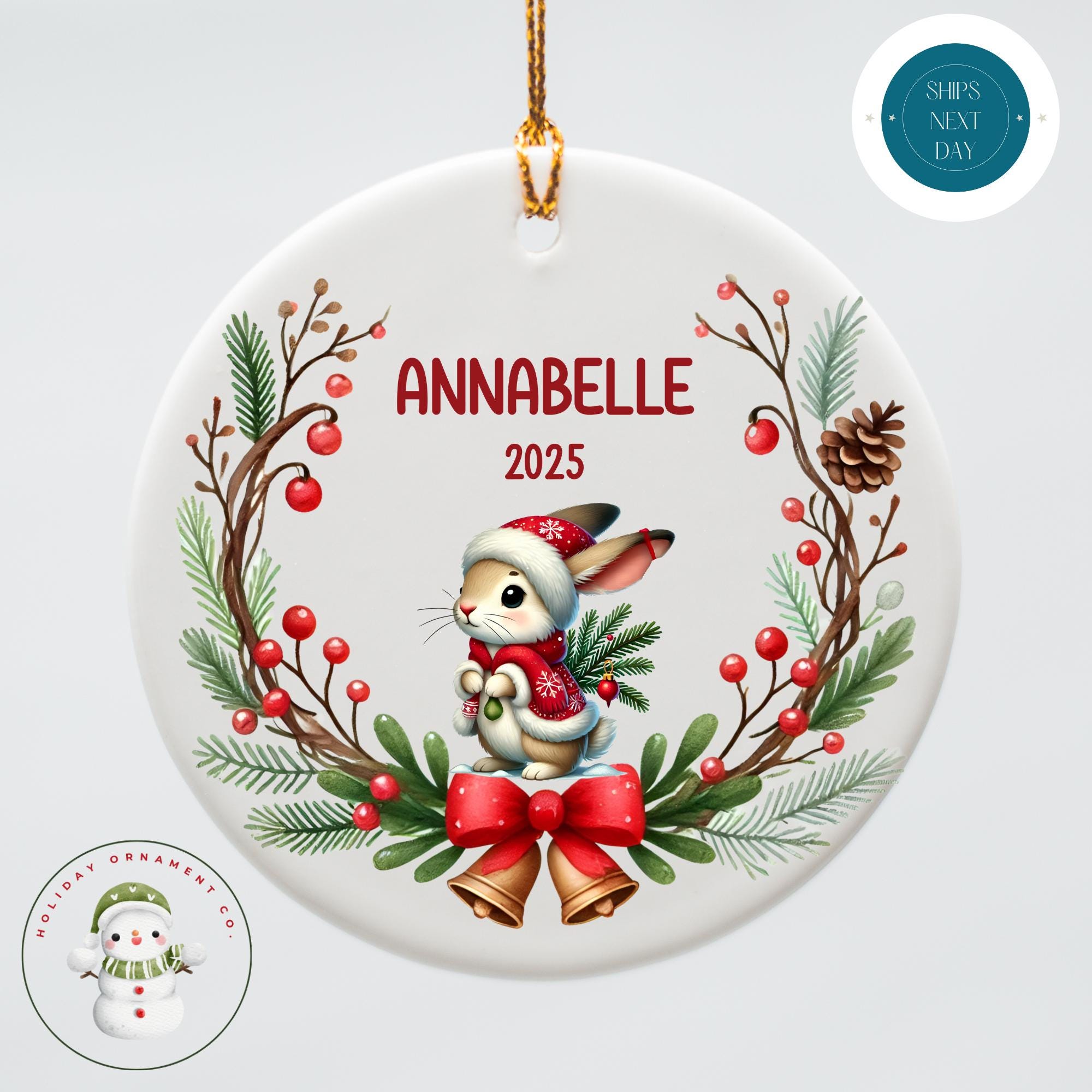 Personalized Bunny Wreath Christmas Ornament | Keepsake Ceramic Holiday Ornament