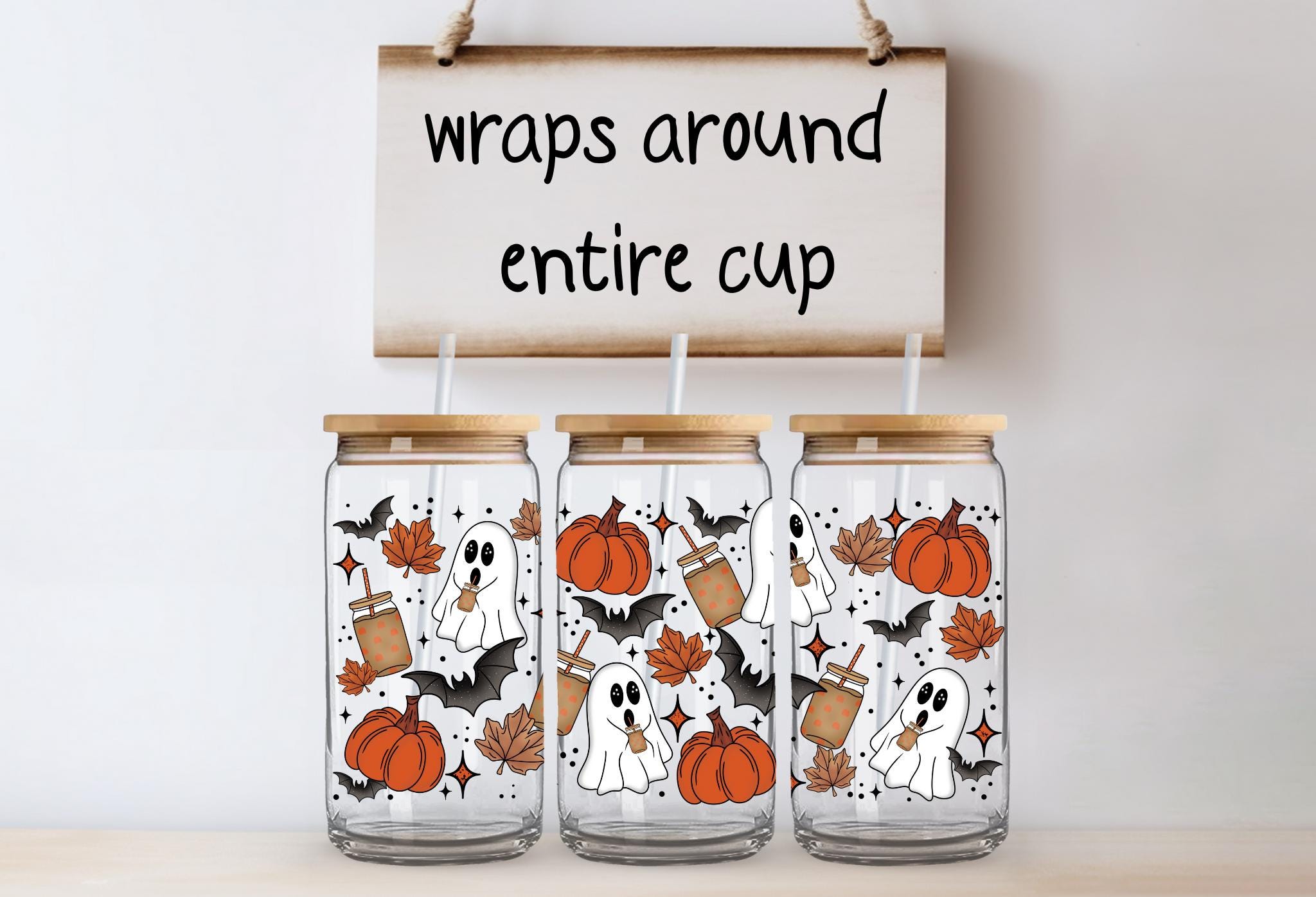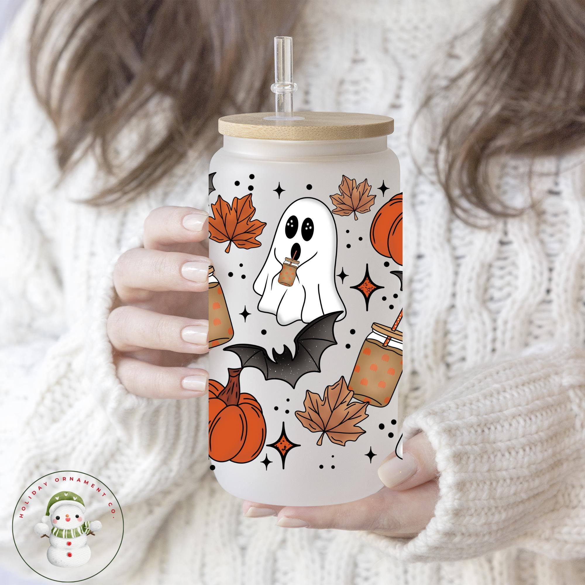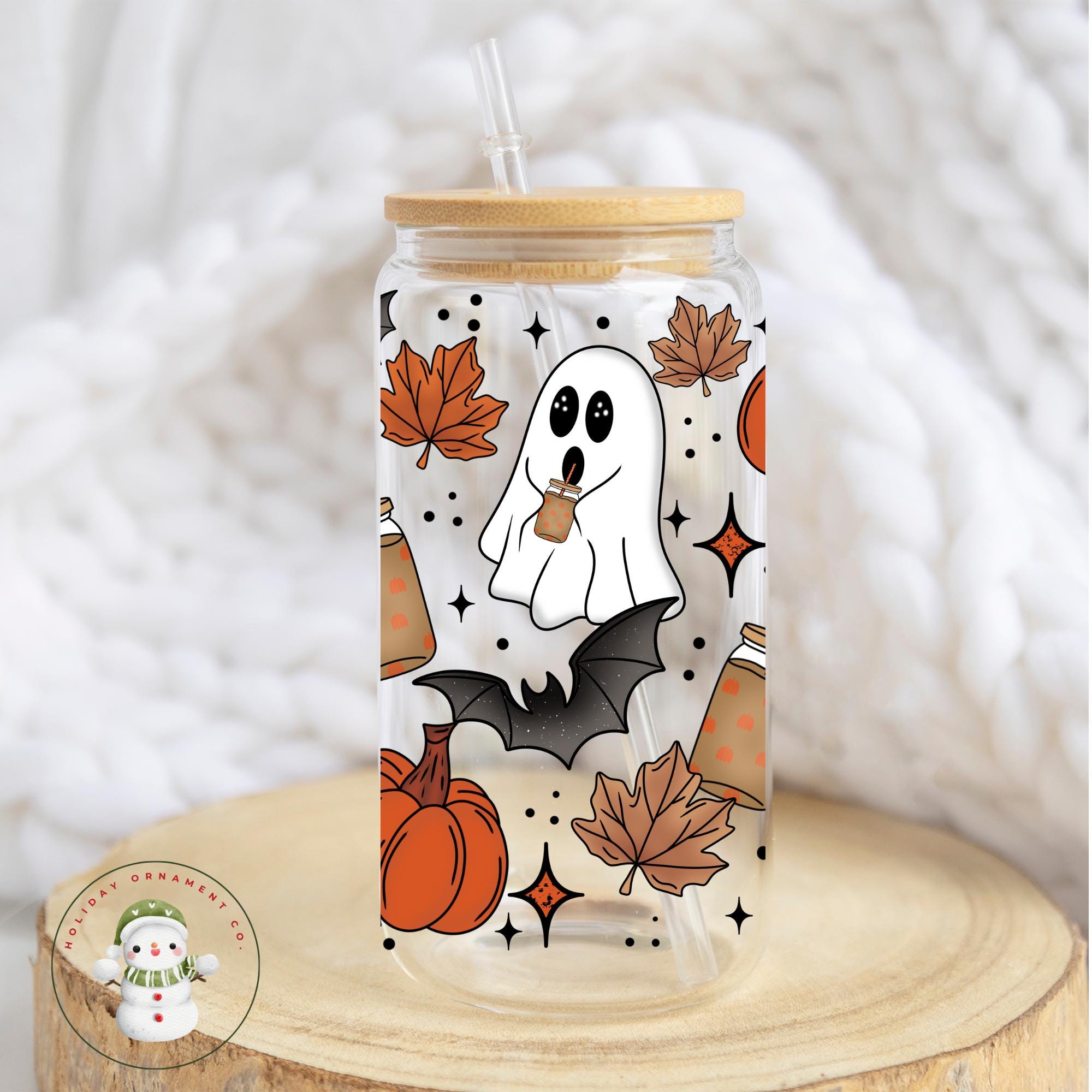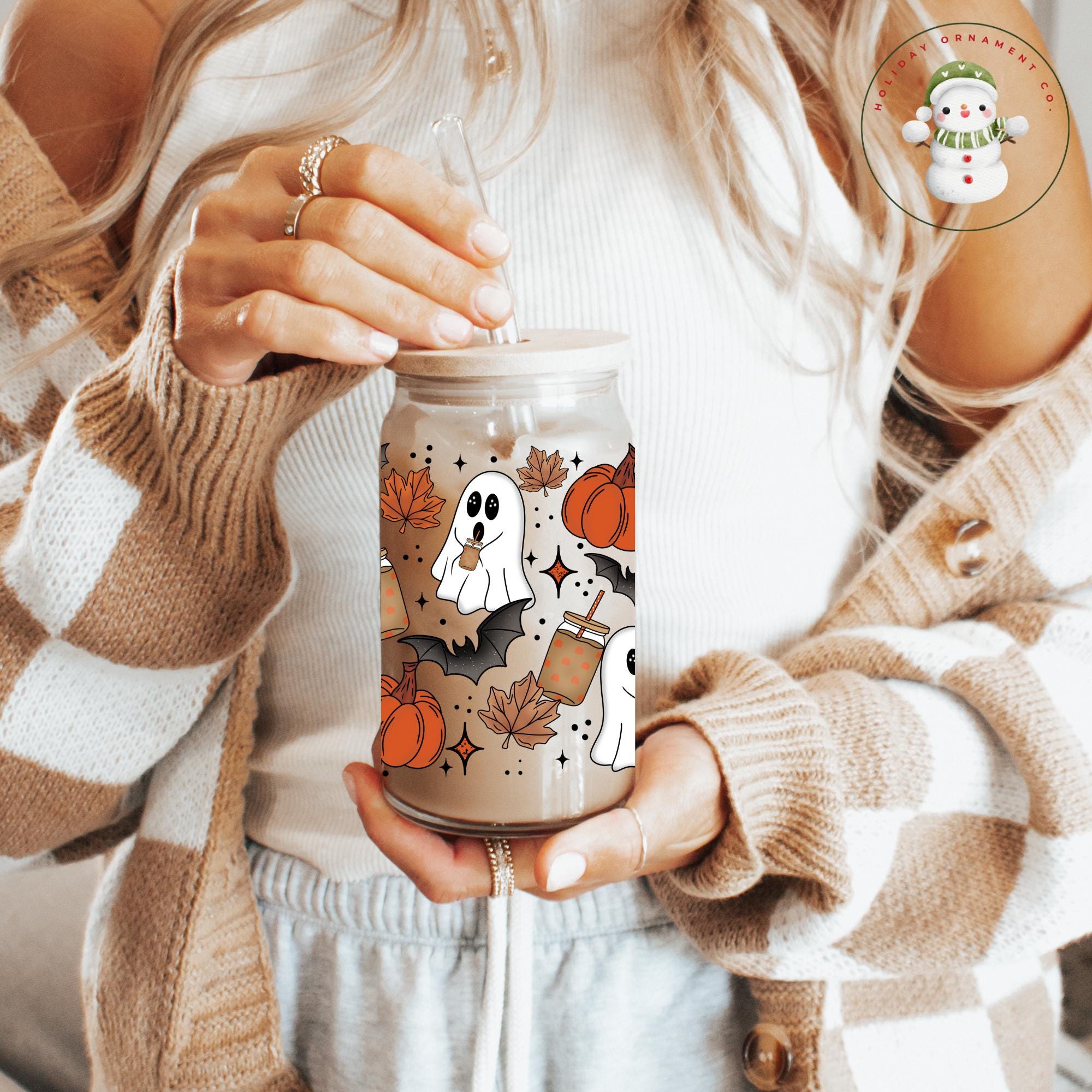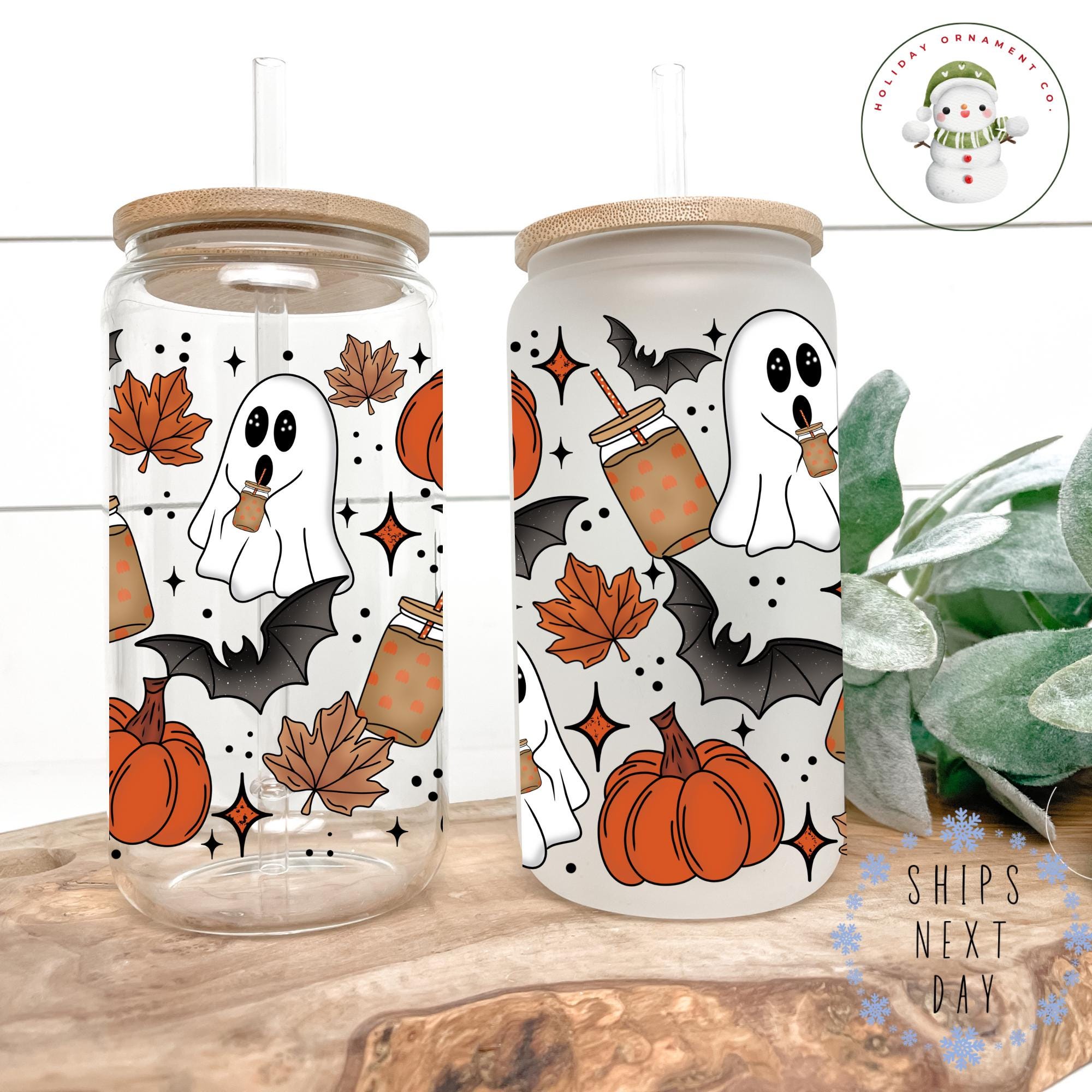 Fall Ghost Pumpkin Iced Coffee Glass Tumbler: Halloween Cup (16 oz/20 oz)