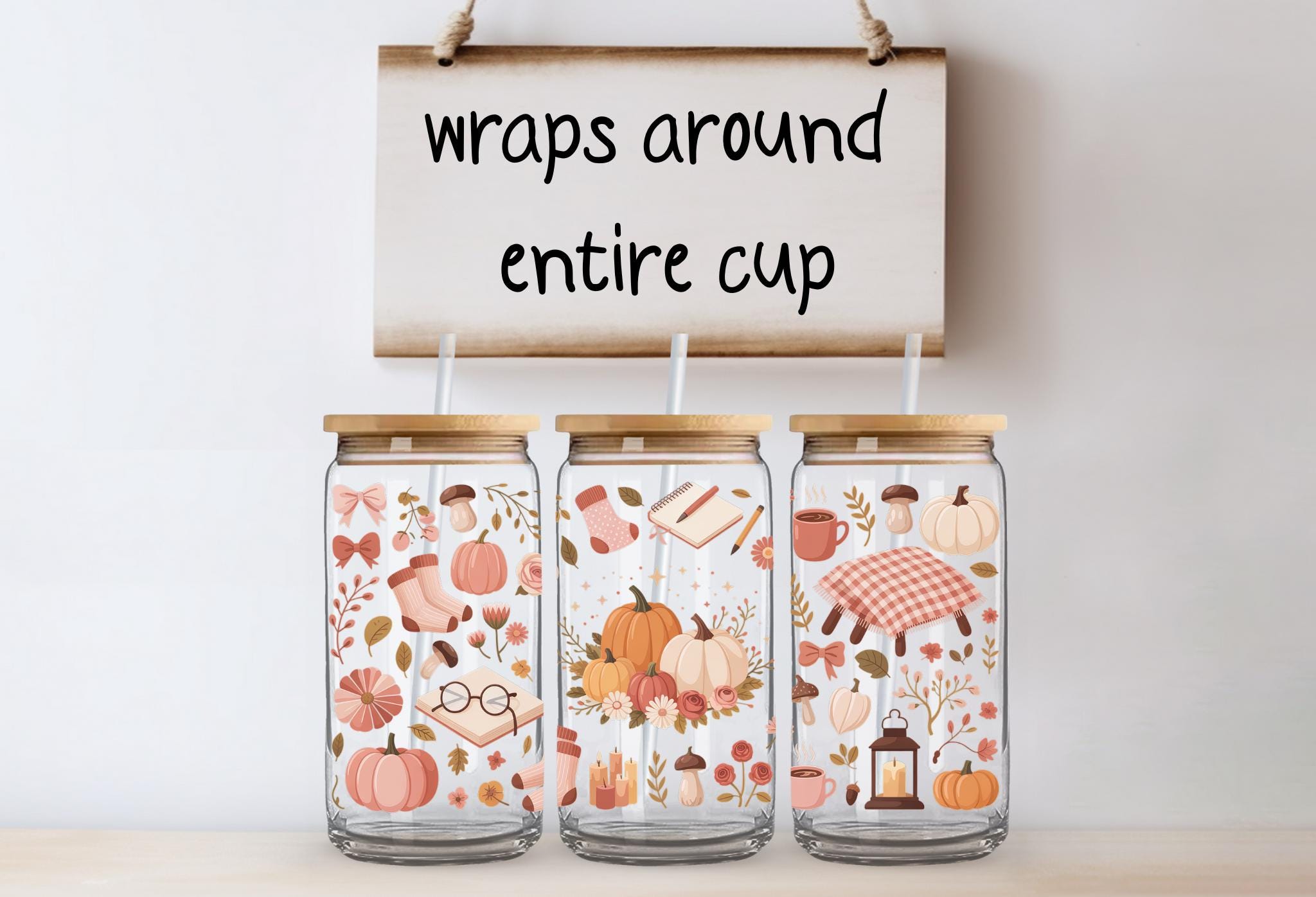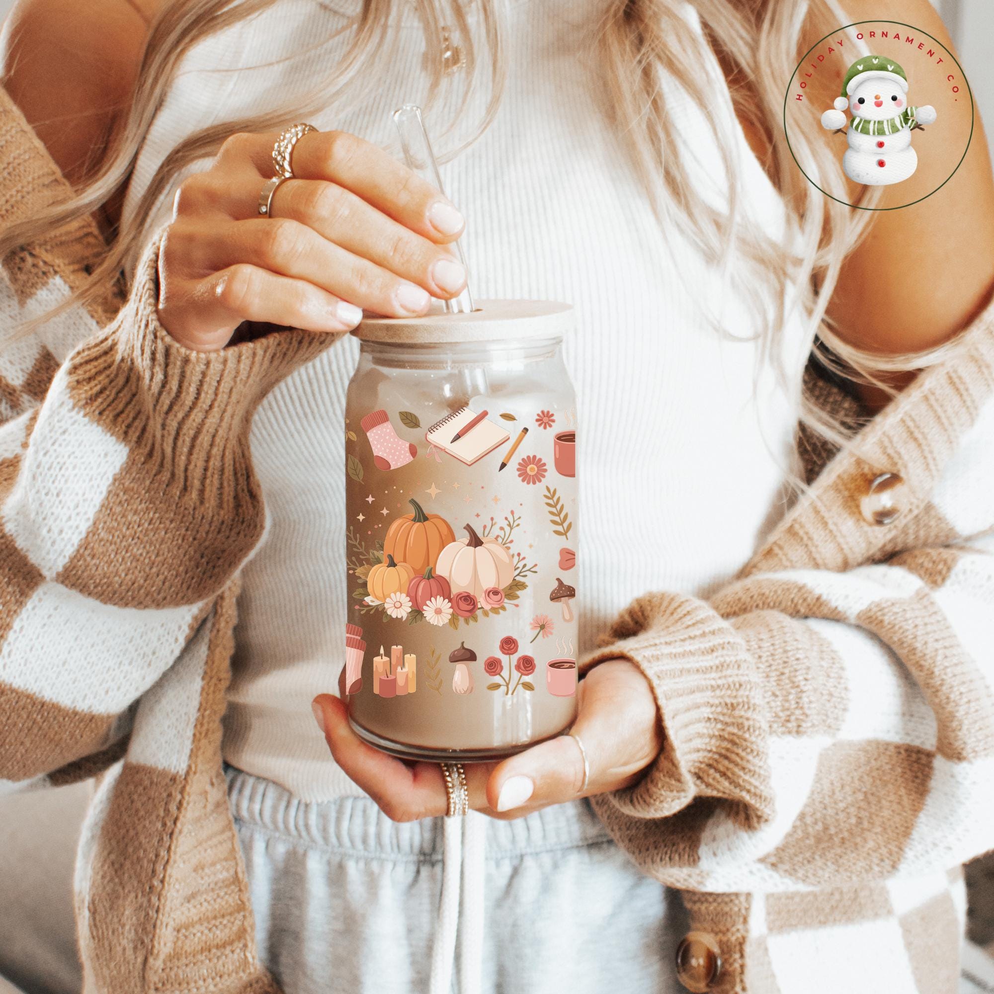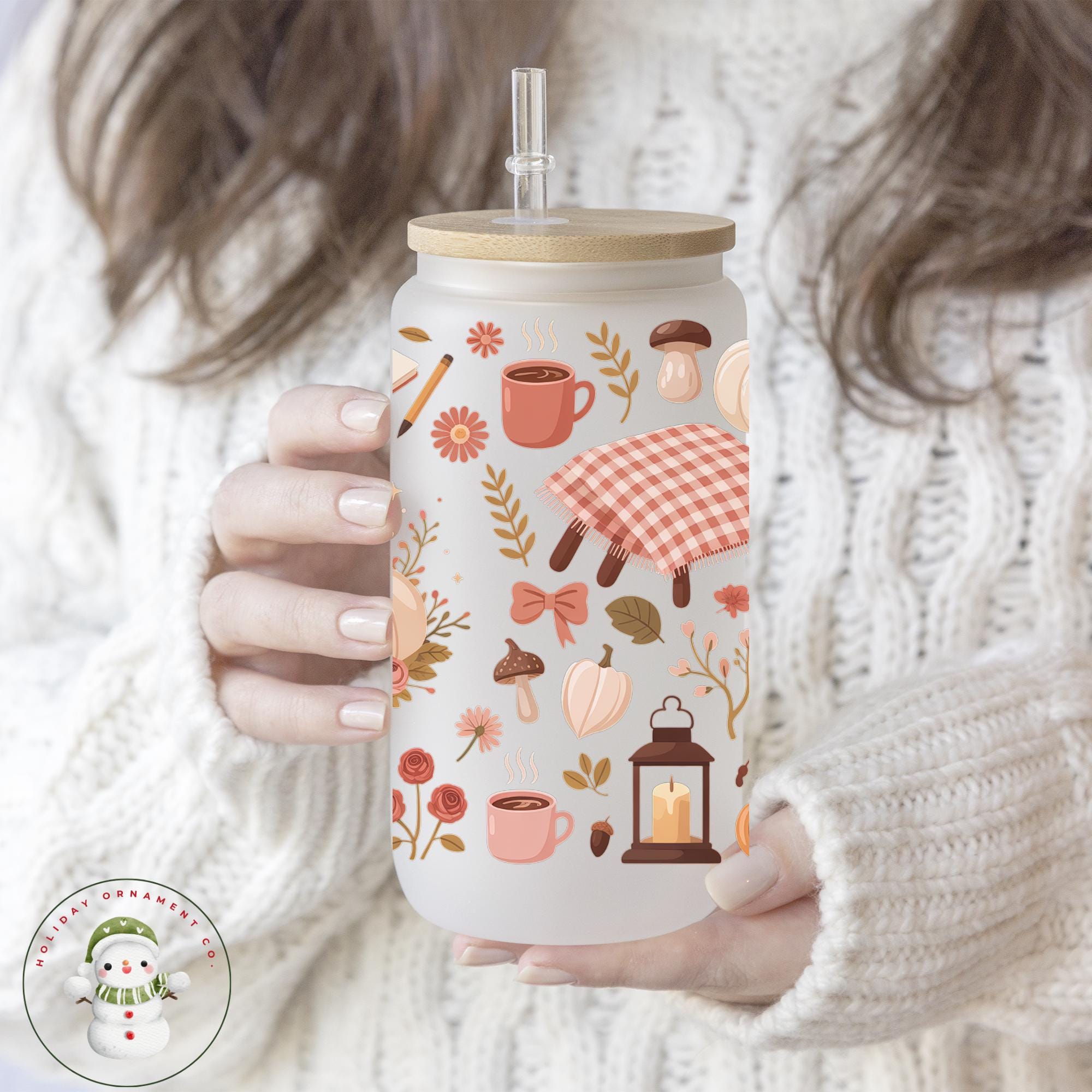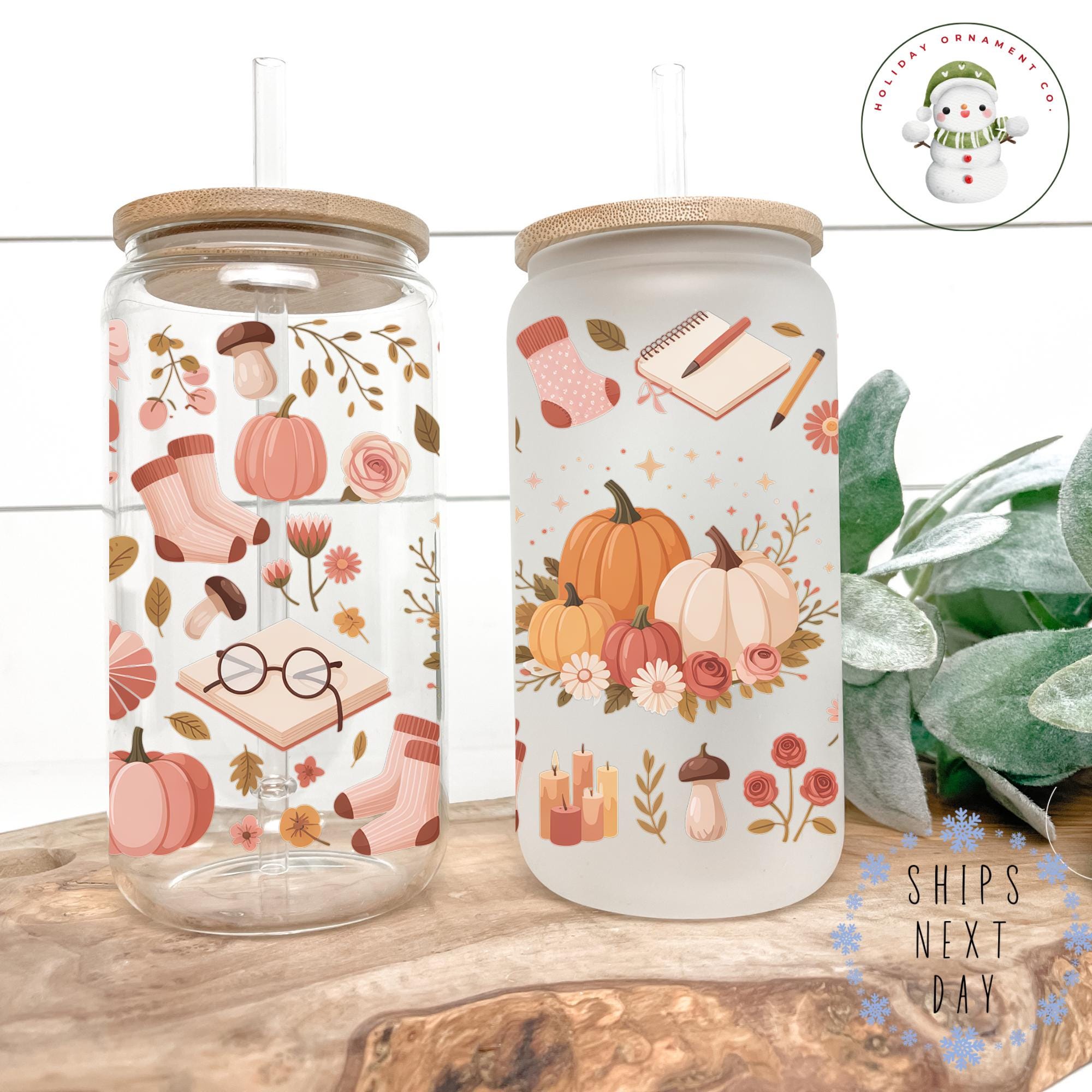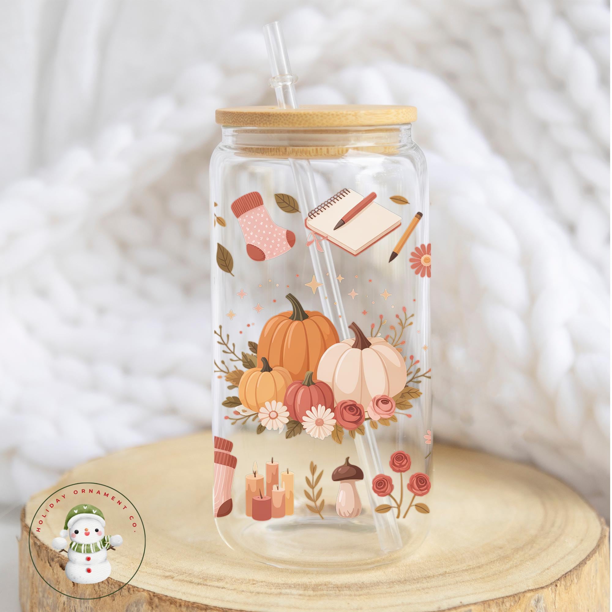 🎄This Custom designed glass tumbler cups come in 16 oz and 20 oz and have a bamboo lid and reusable glass straw.