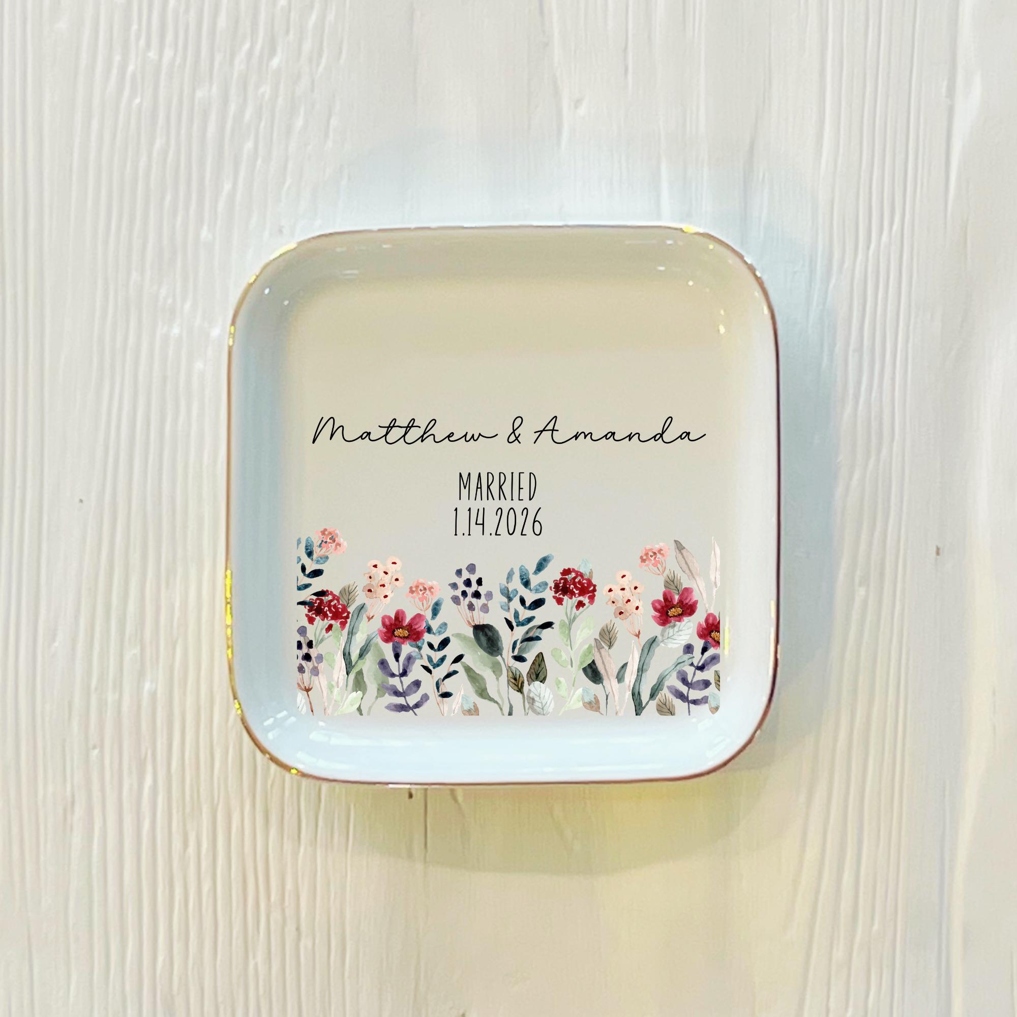 Personalized Wildflower Couples Married Square Ring Trinket Dish | Keepsake Gift