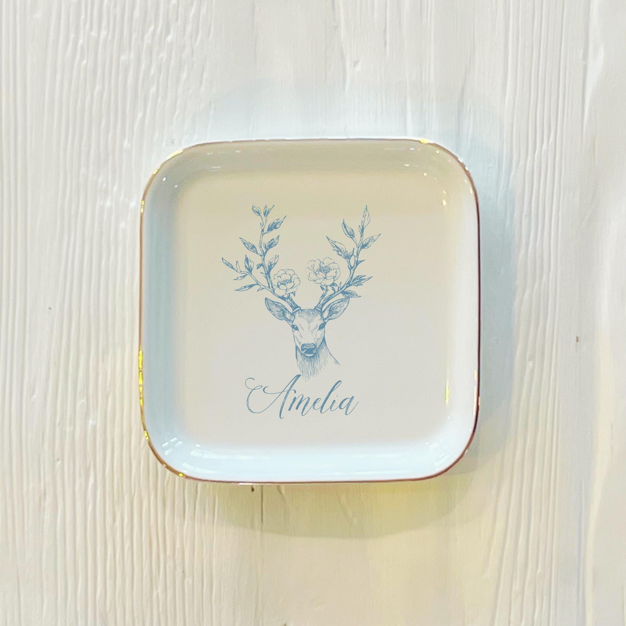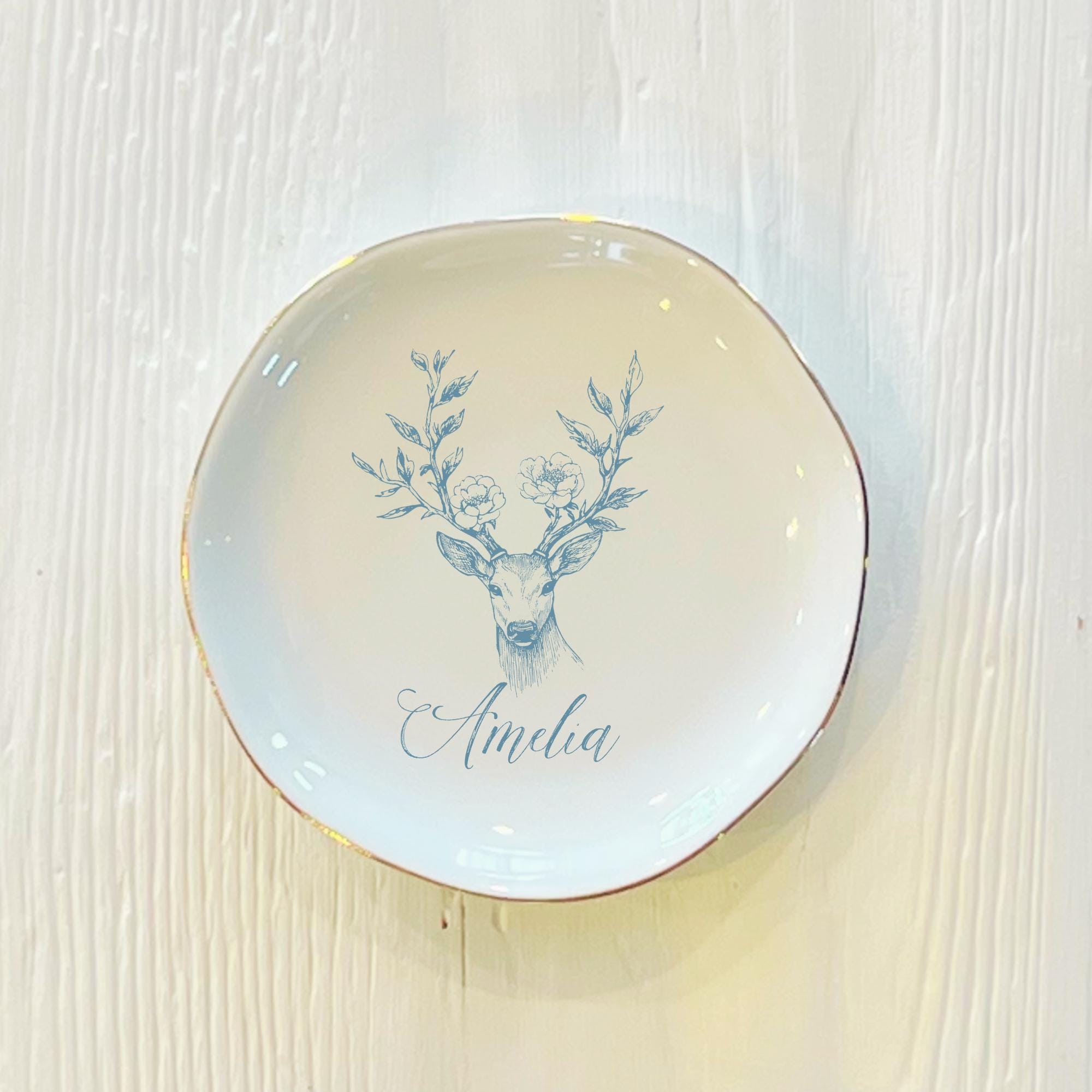 Personalized Blue Toile Deer Ring Dish: Chinoiserie Jewelry Trinket Dish