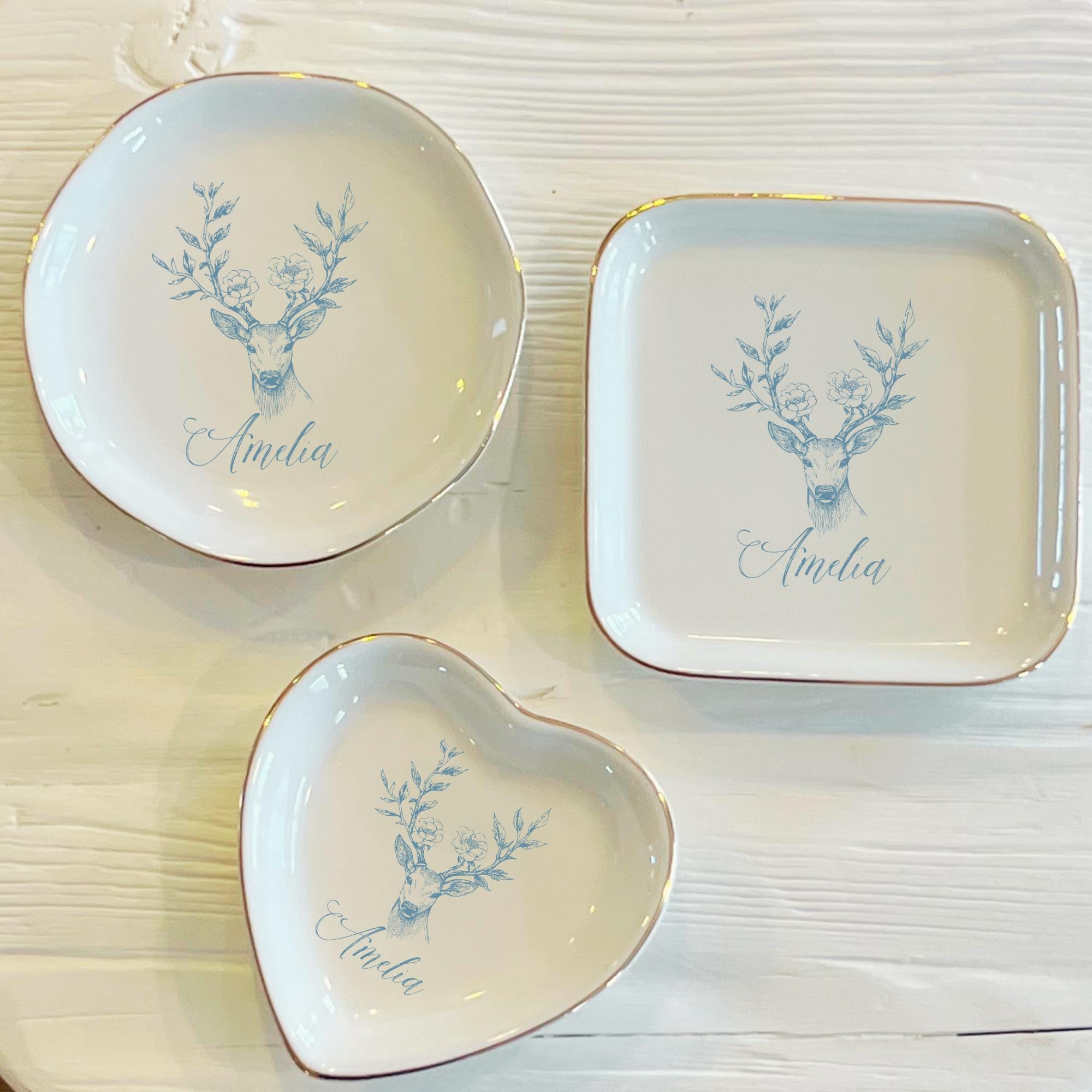 🎄This Custom designed trinket ceramic dish is beautifully crafted and personalized. It will arrive safely wrapped in its own white box. Choose from square, round or heart, each has a gold edge.