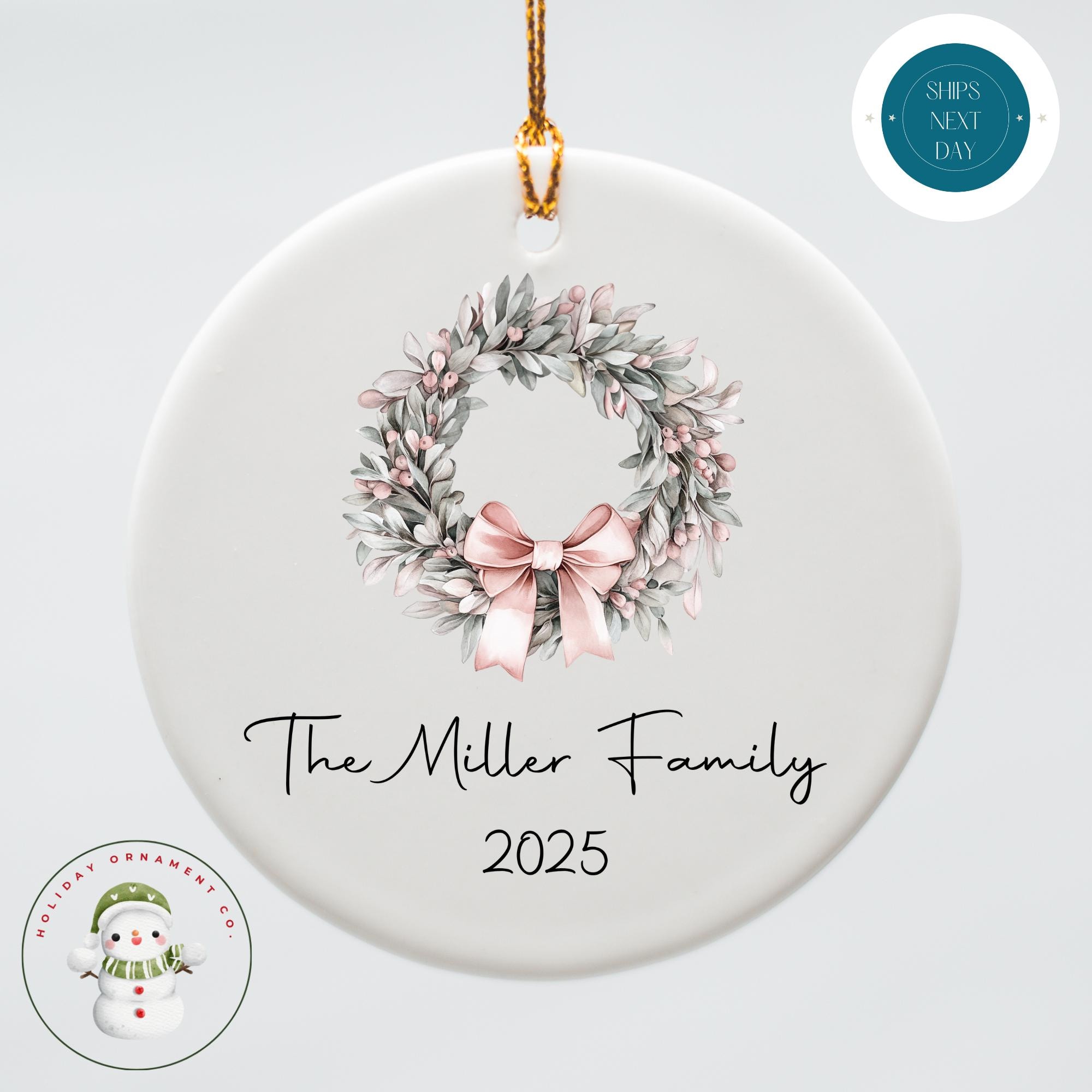 Pink Wreath Family Name Christmas Ornament: Custom Ceramic Keepsake