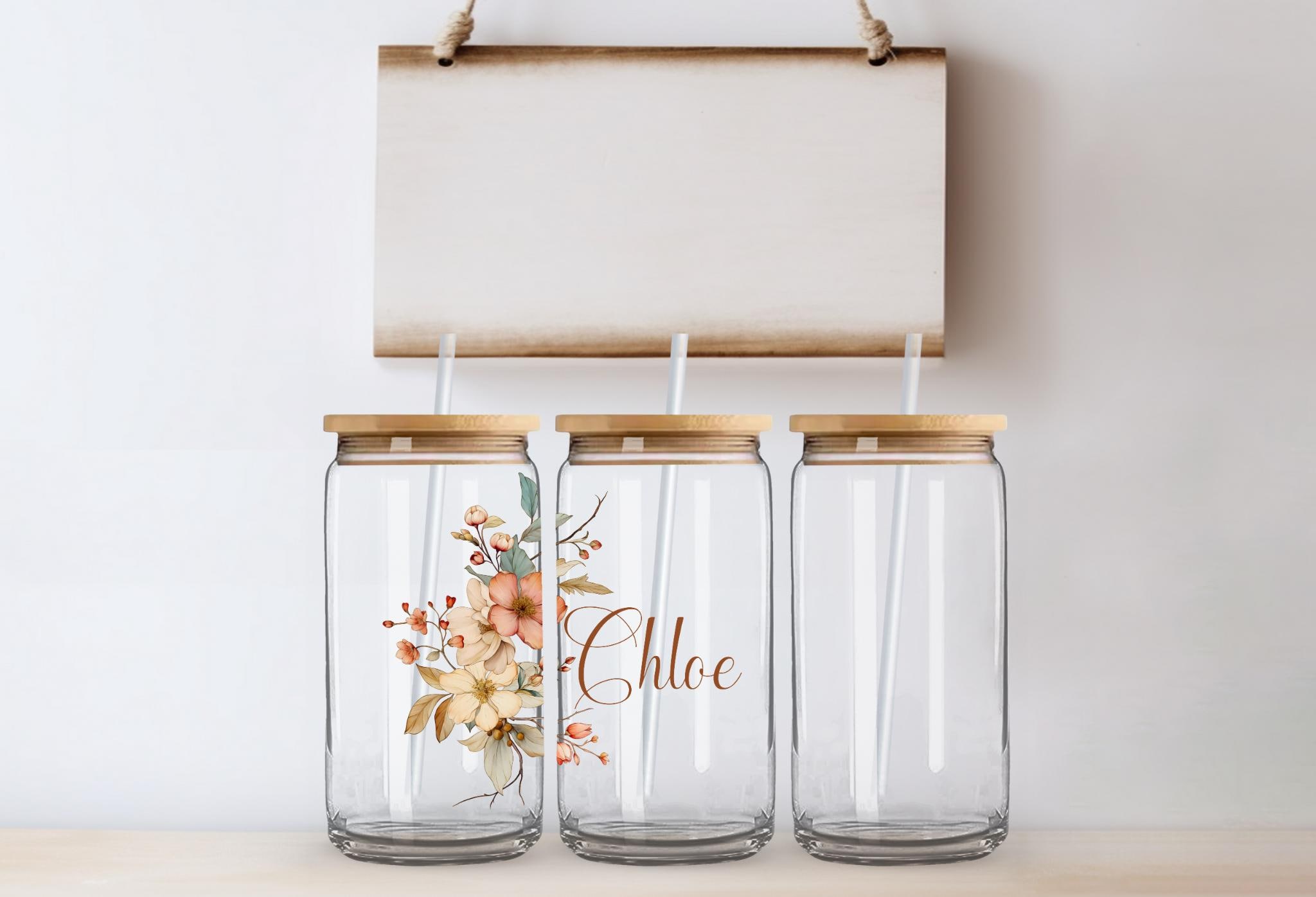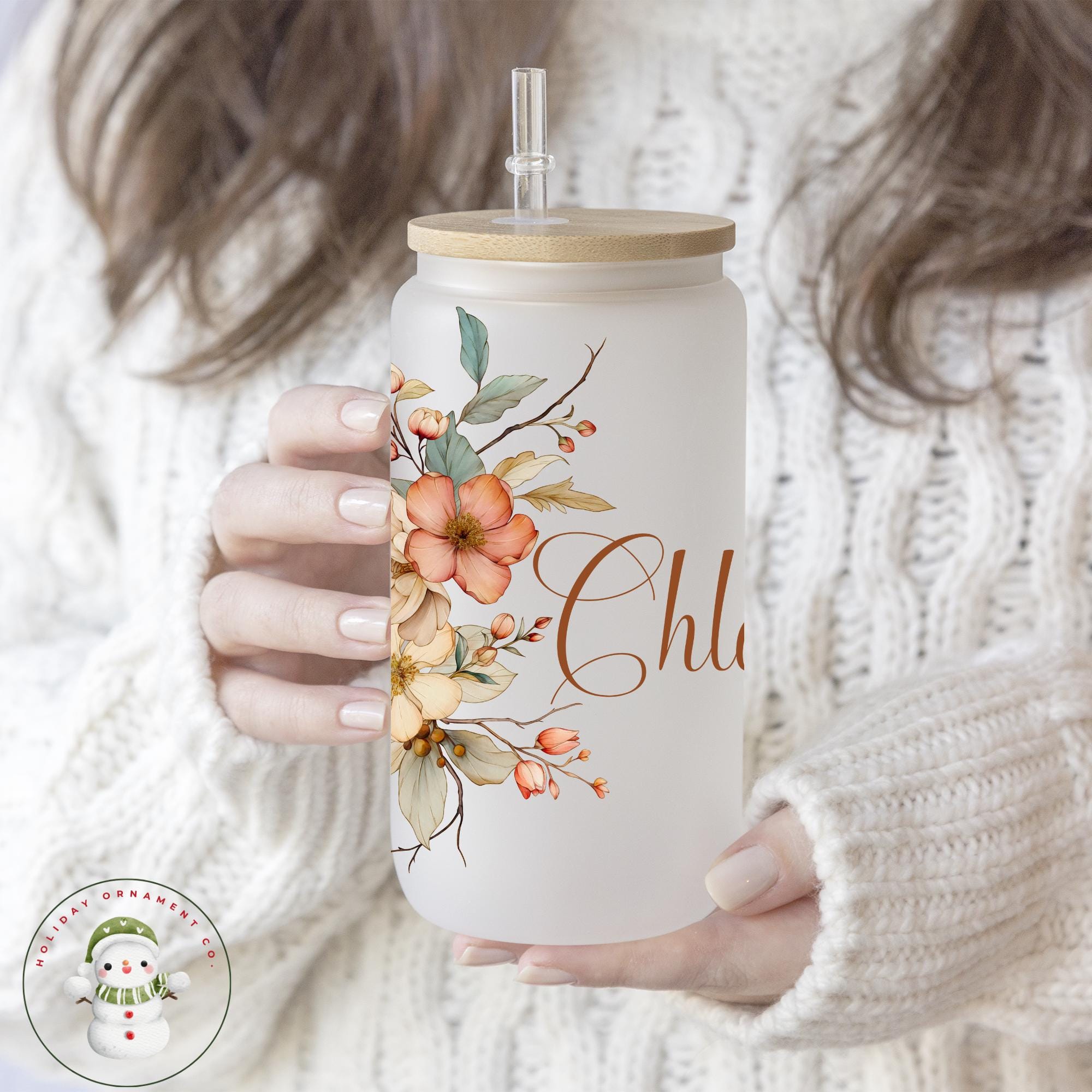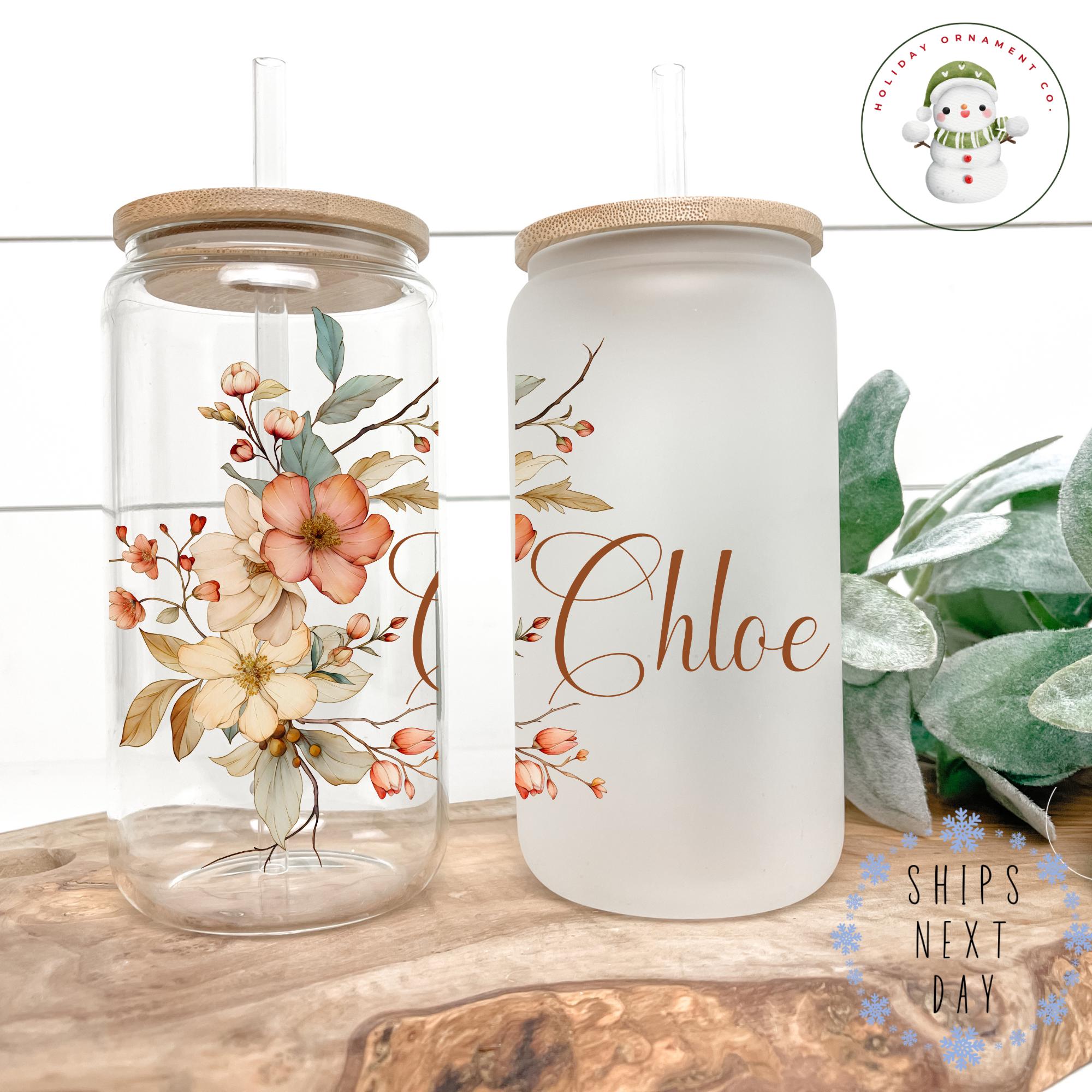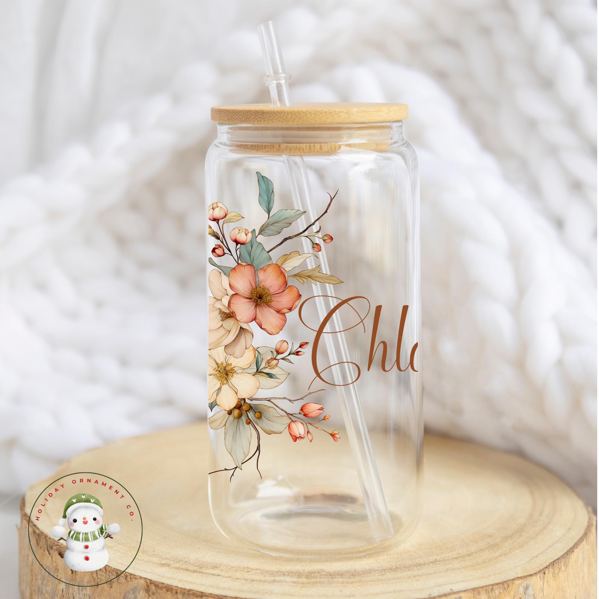 Personalized Boho Flower Glass Tumbler with Bamboo Lid & Straw (16/20 oz)