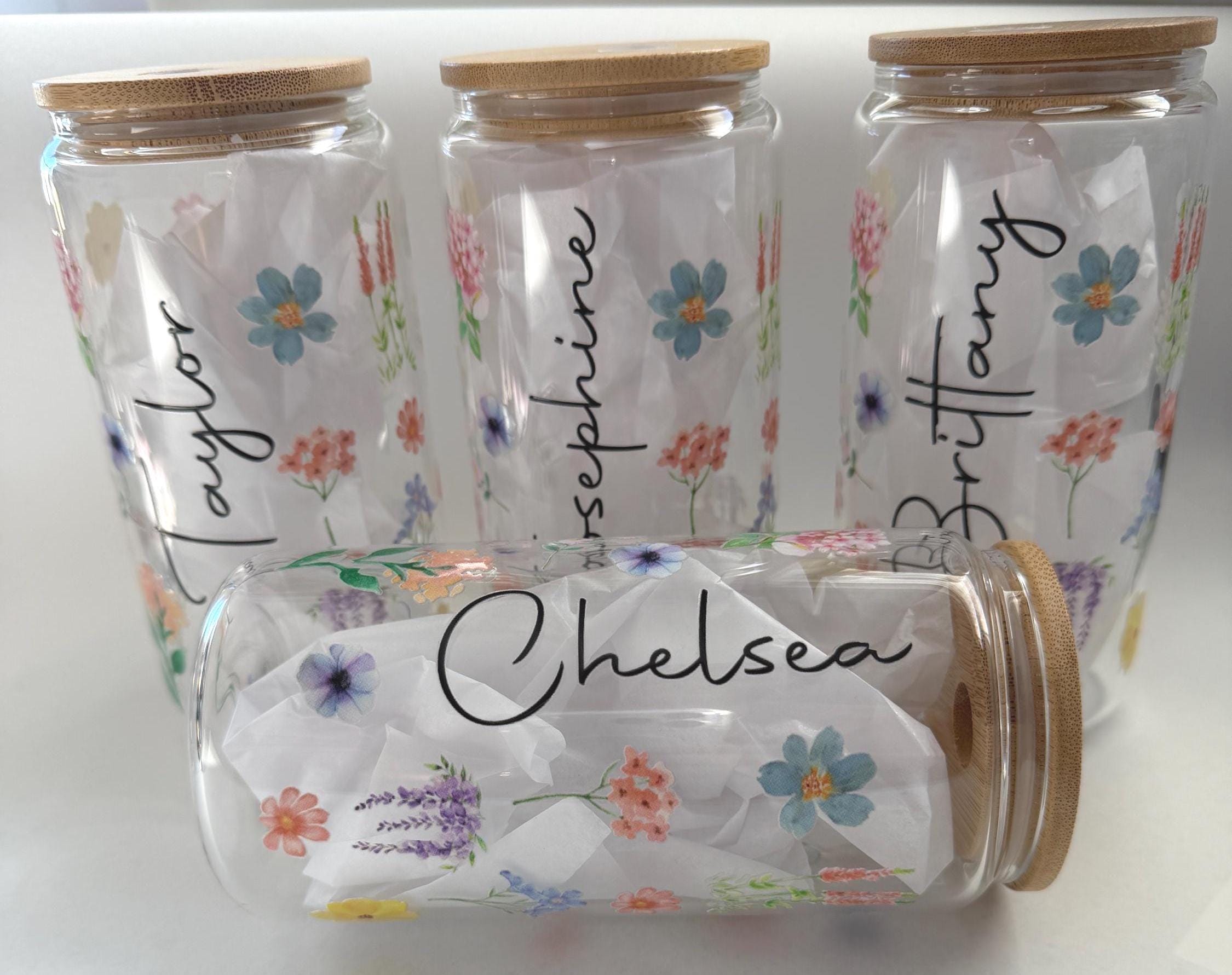 Personalized Watercolor Flowers Glass Tumbler with Bamboo Lid & Straw (16/20 oz)