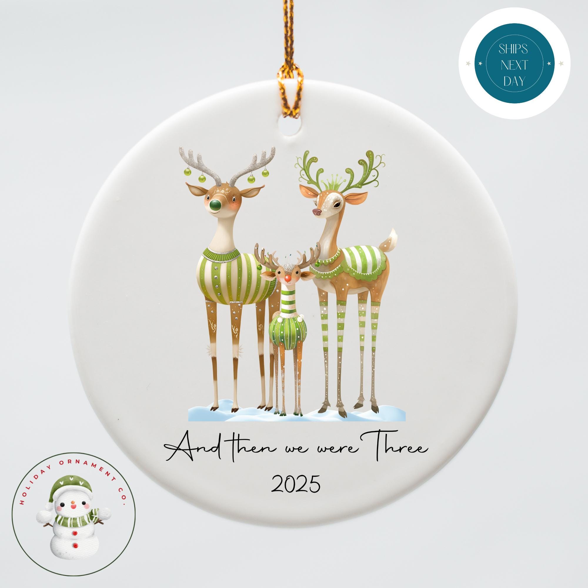 First Christmas As A Family of Three Reindeer Ornament | Peculiar Green Reindeer Family | Cute Holiday Family Ornament