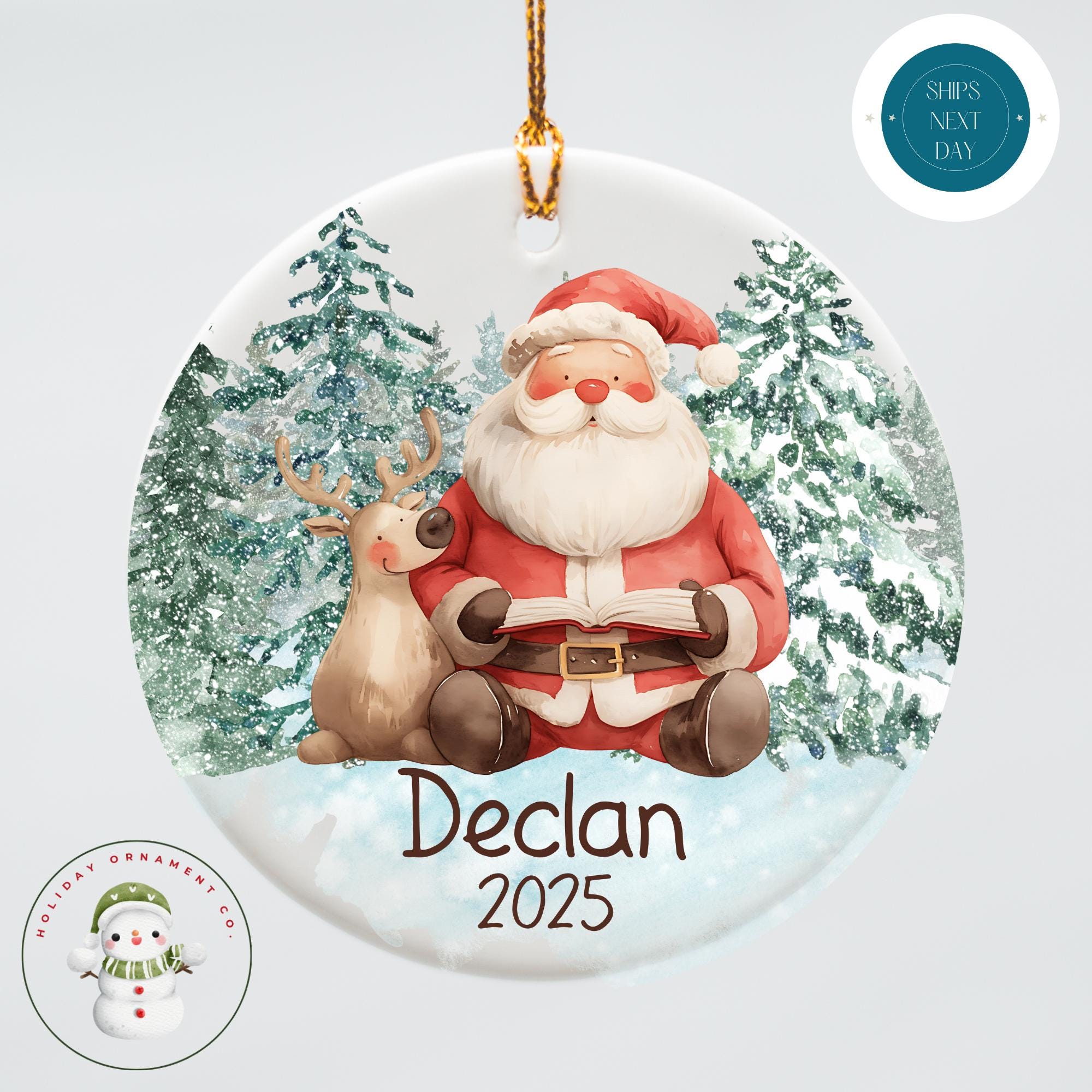Personalized Santa Reading Reindeer Christmas Ornament | 2025 Holiday Ornament | Sibling Ornament