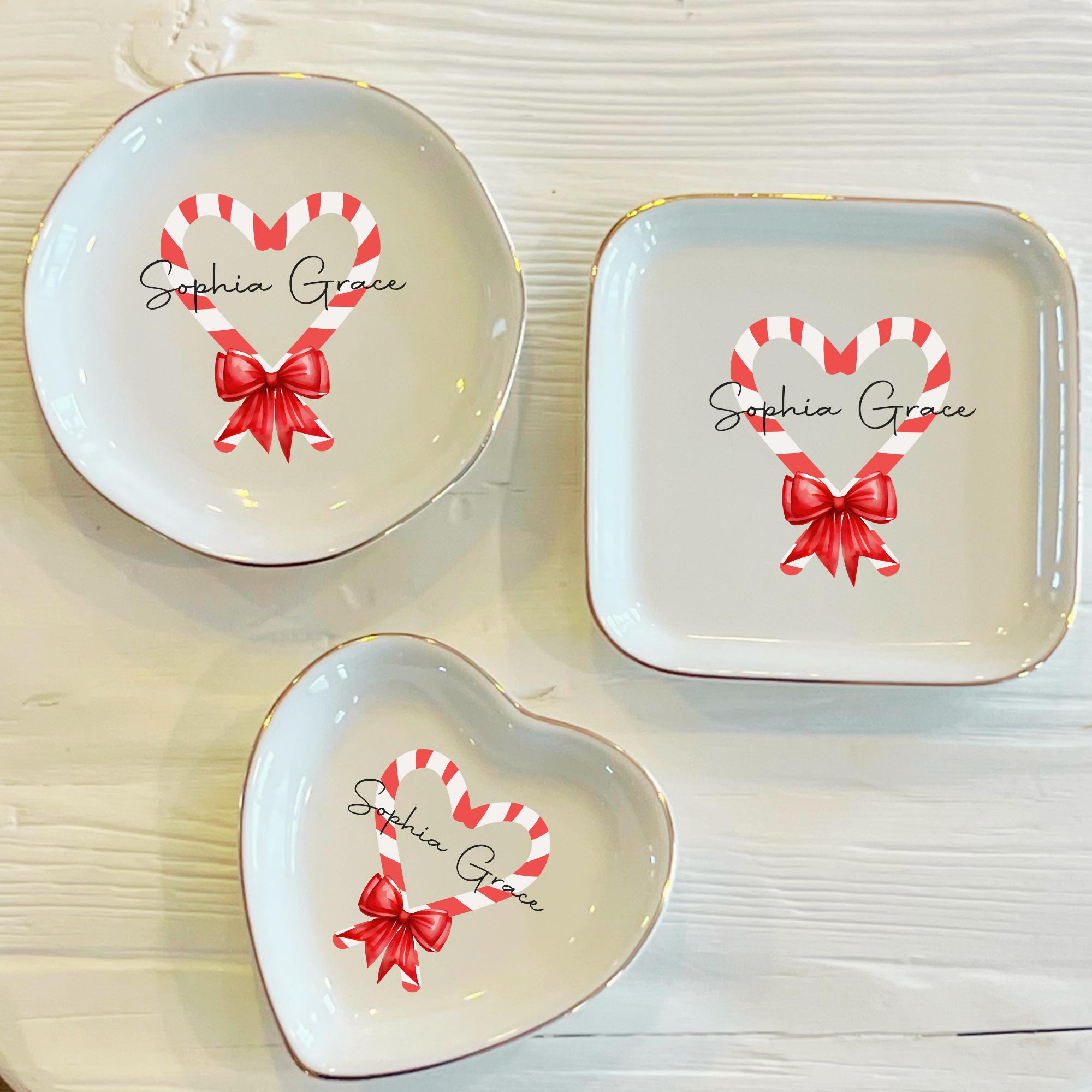 🎄This Custom designed trinket ceramic dish is beautifully crafted and personalized. It will arrive safely wrapped in its own white box. Choose from square, round or heart, each has a gold edge.