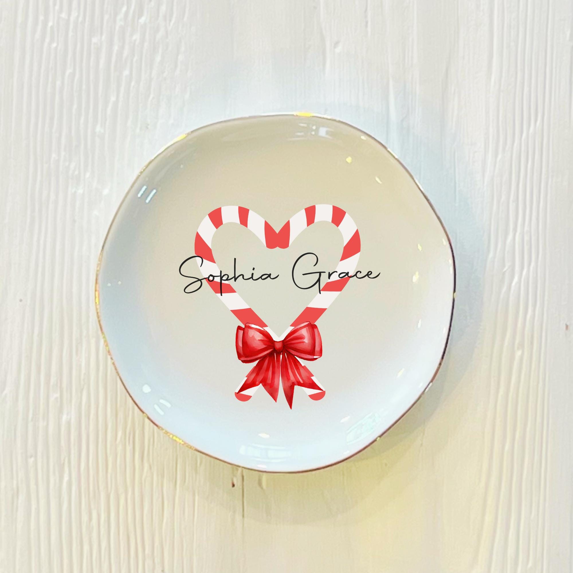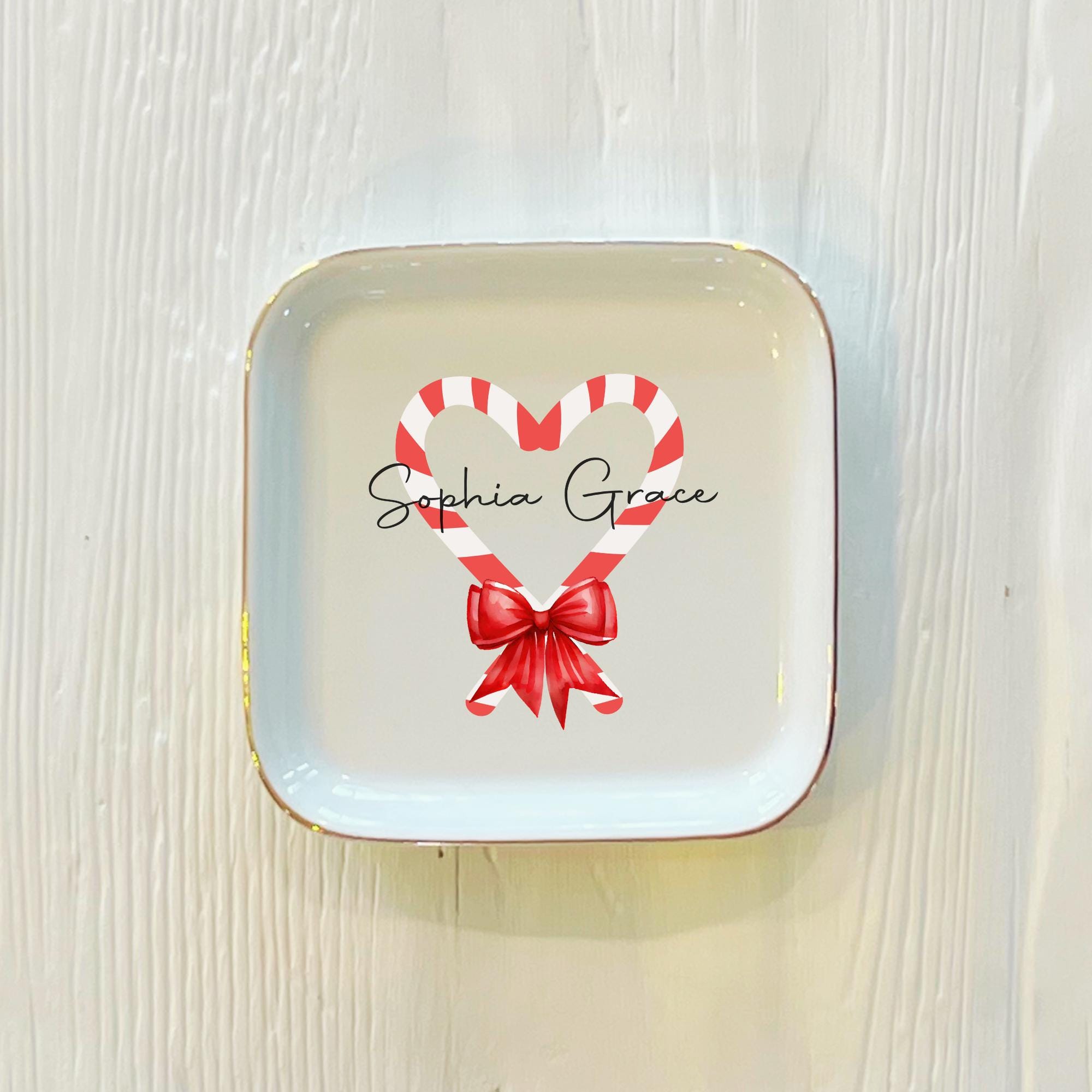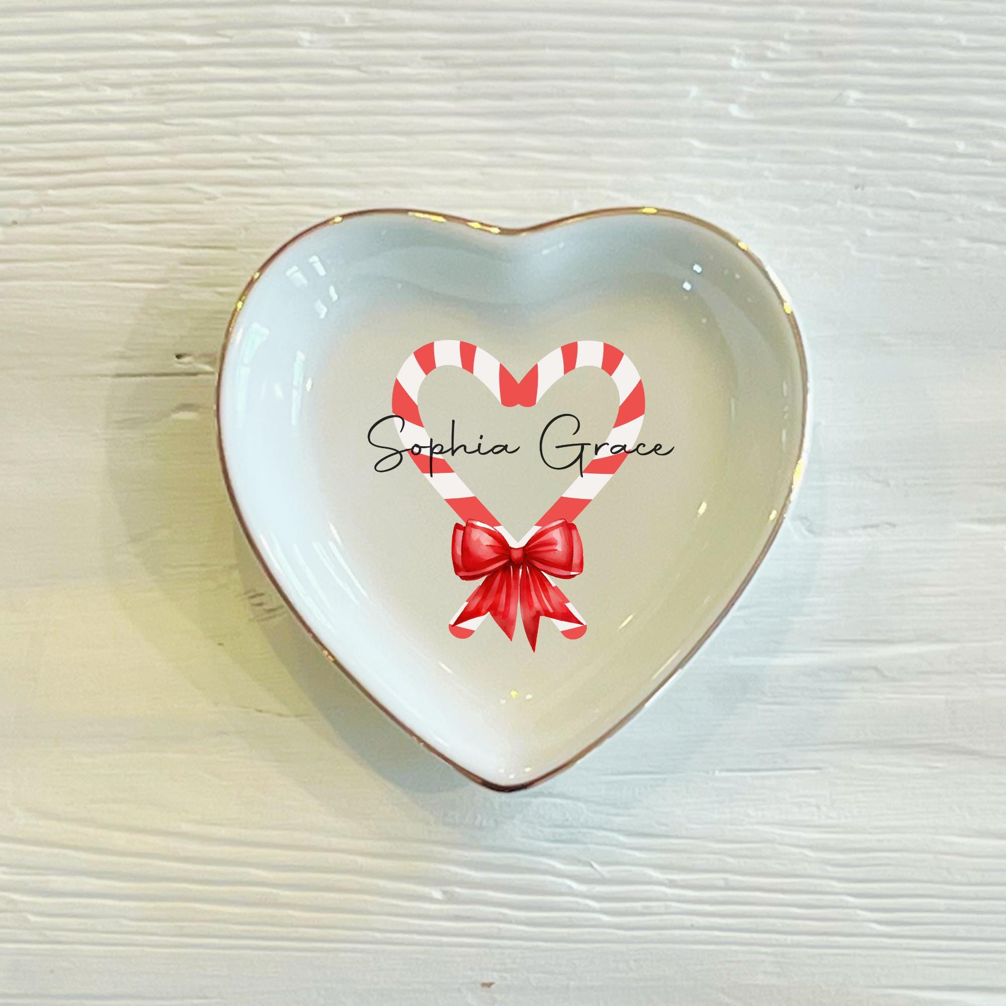 Personalized Candy Cane Heart Ceramic Trinket Dish | Custom Christmas Ring Holder