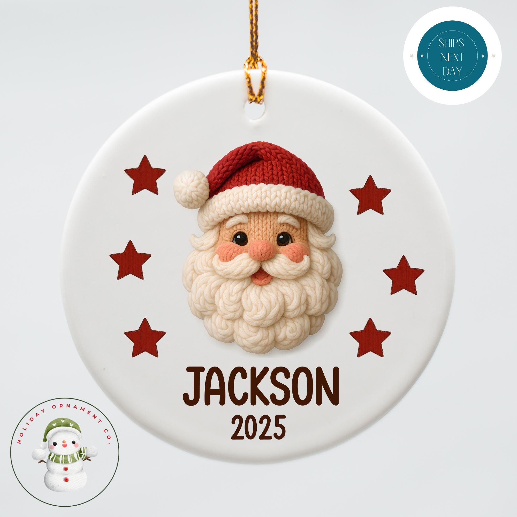 Personalized Faux Yarn Santa Ceramic Holiday Ornament | Kids Name Christmas Ornament