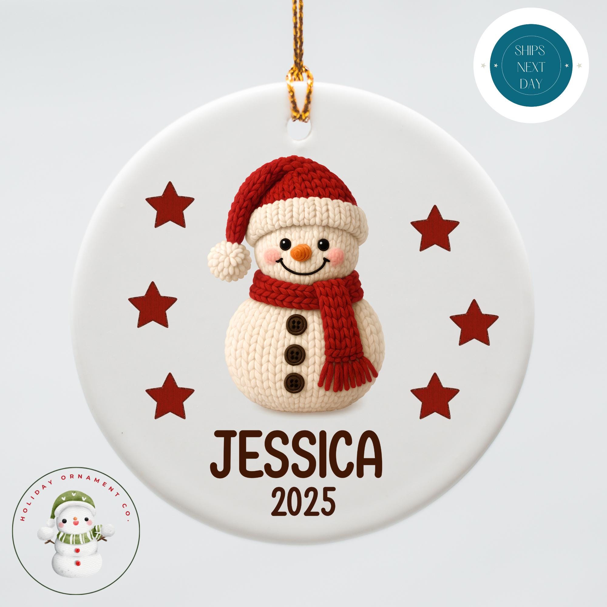 Personalized Faux Yarn Snowman Ceramic Holiday Ornament | Kids Name Christmas Ornament