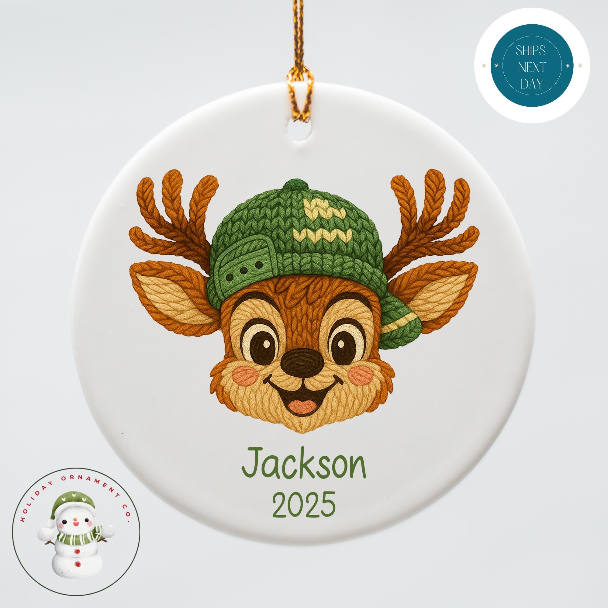Personalized Faux Yarn Boy Reindeer Ceramic Holiday Ornament | Kids Name Christmas Ornament