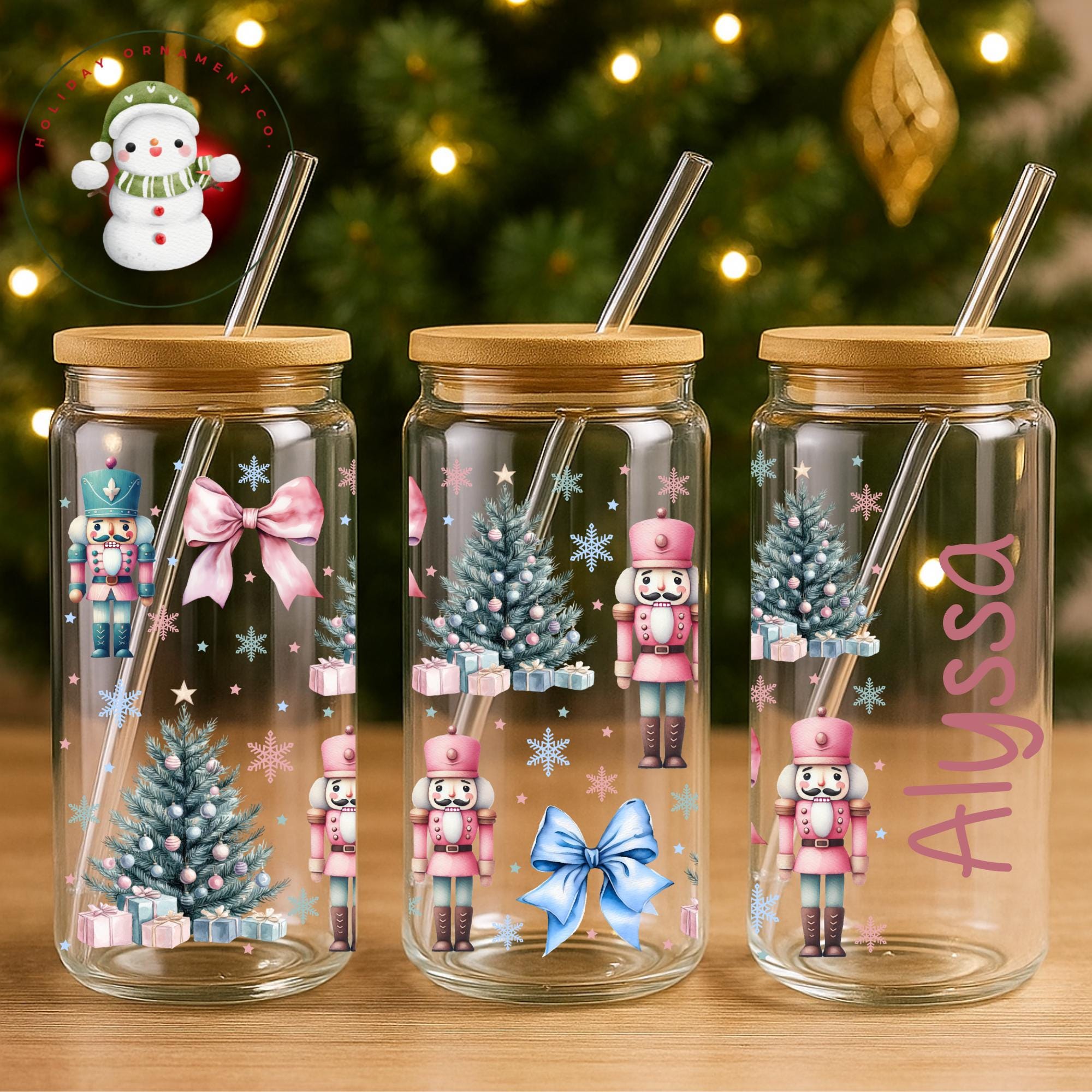 🎄This Custom designed glass tumbler cups come in 16 oz and 20 oz and have a bamboo lid and reusable glass straw.