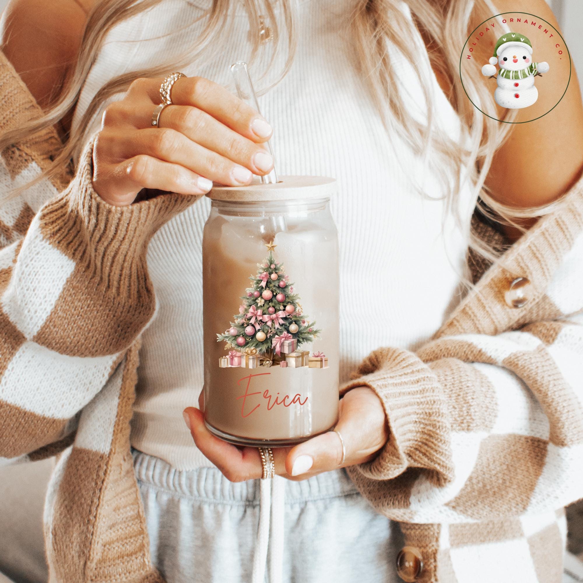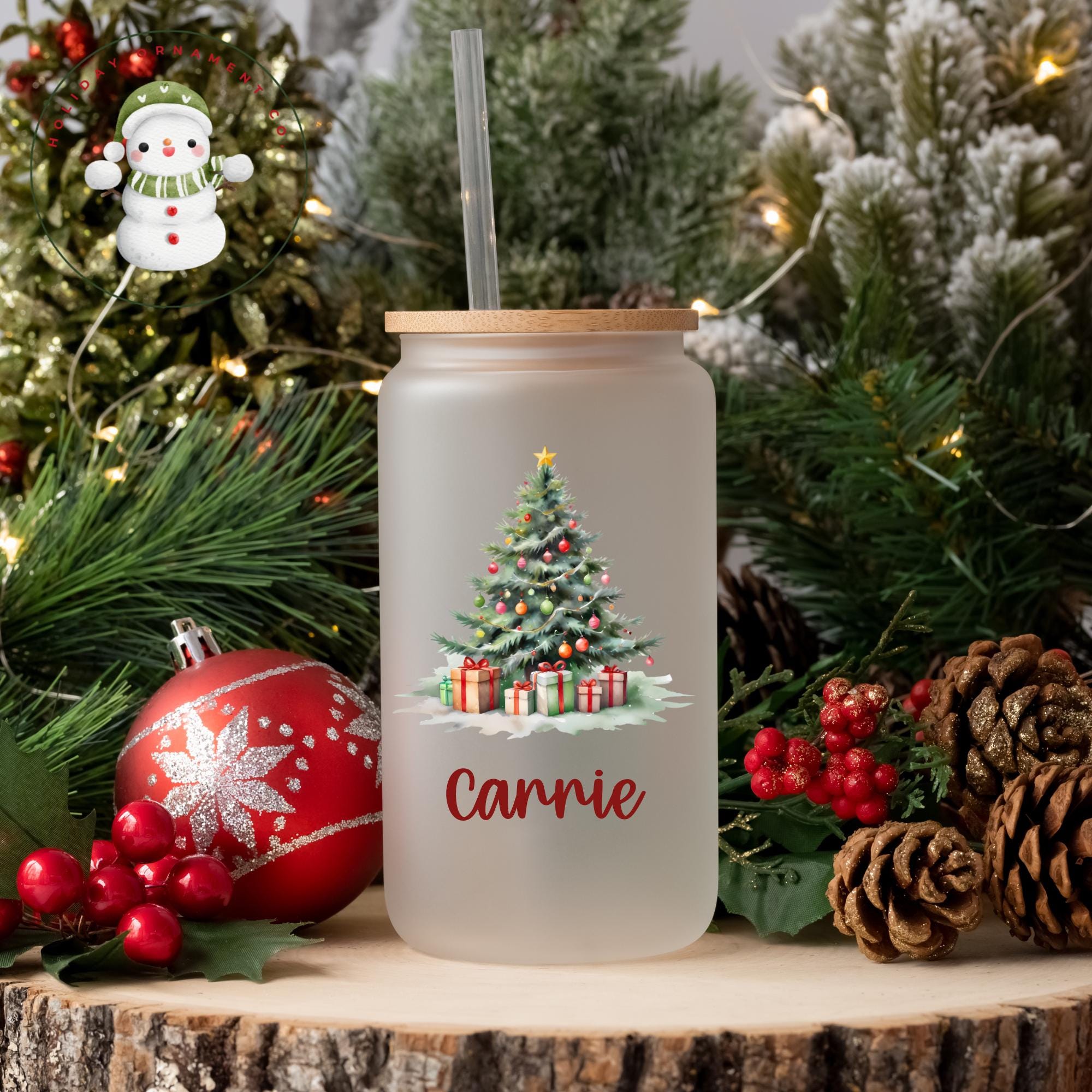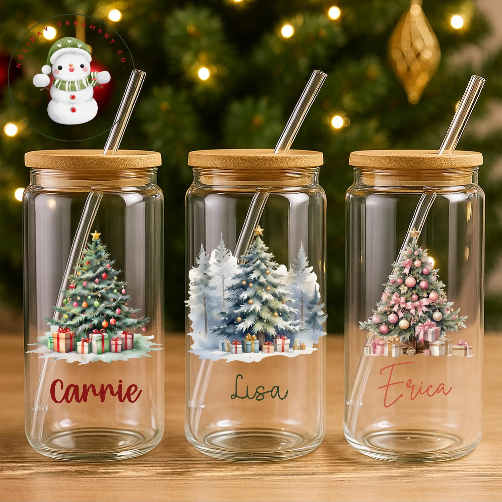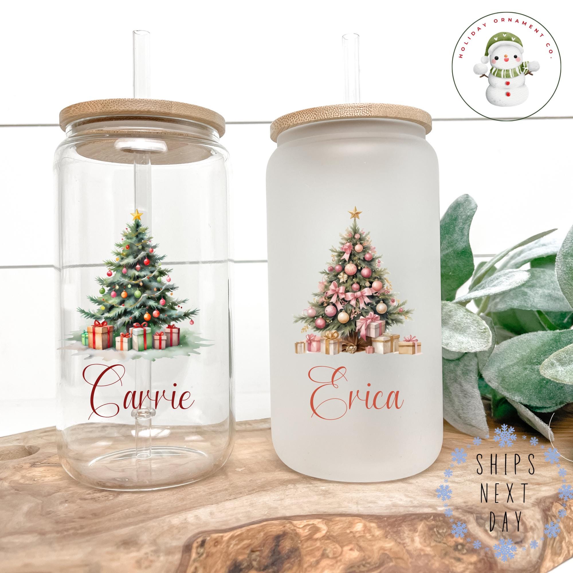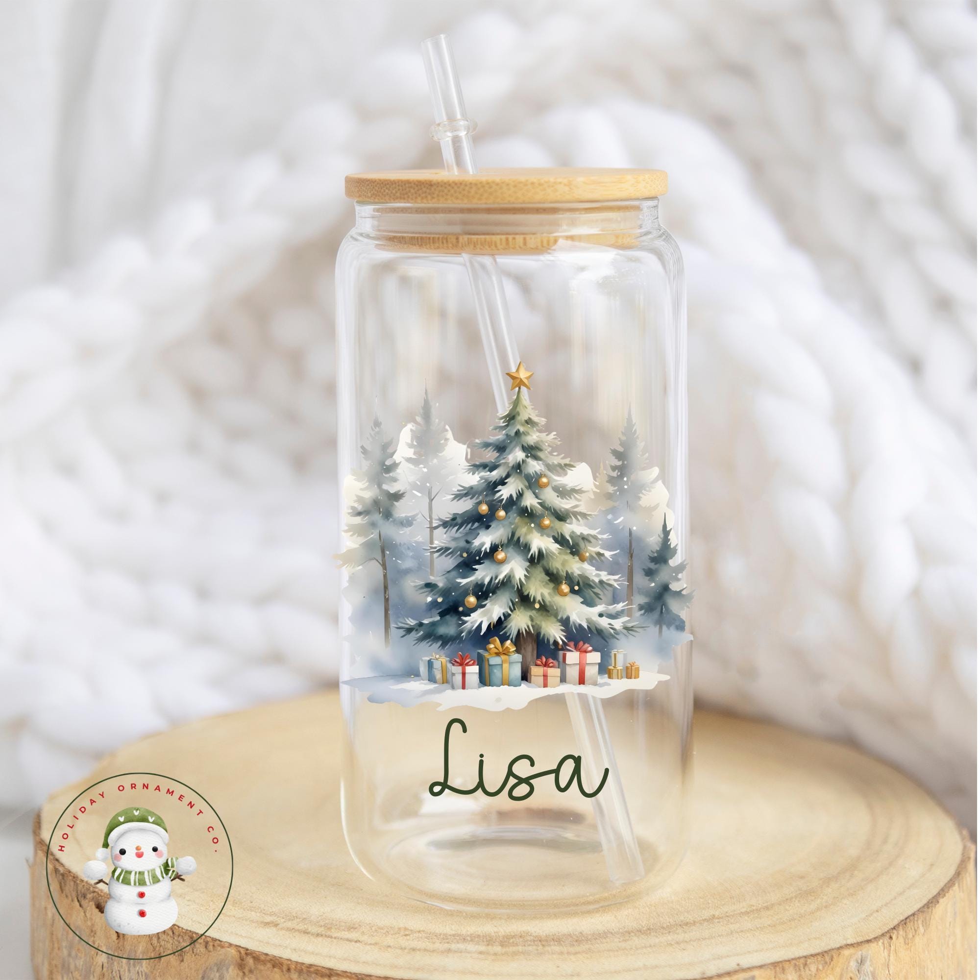 Personalized Christmas Tree Glass Tumbler : Custom Holiday Iced Coffee Cup (16/20 oz)
