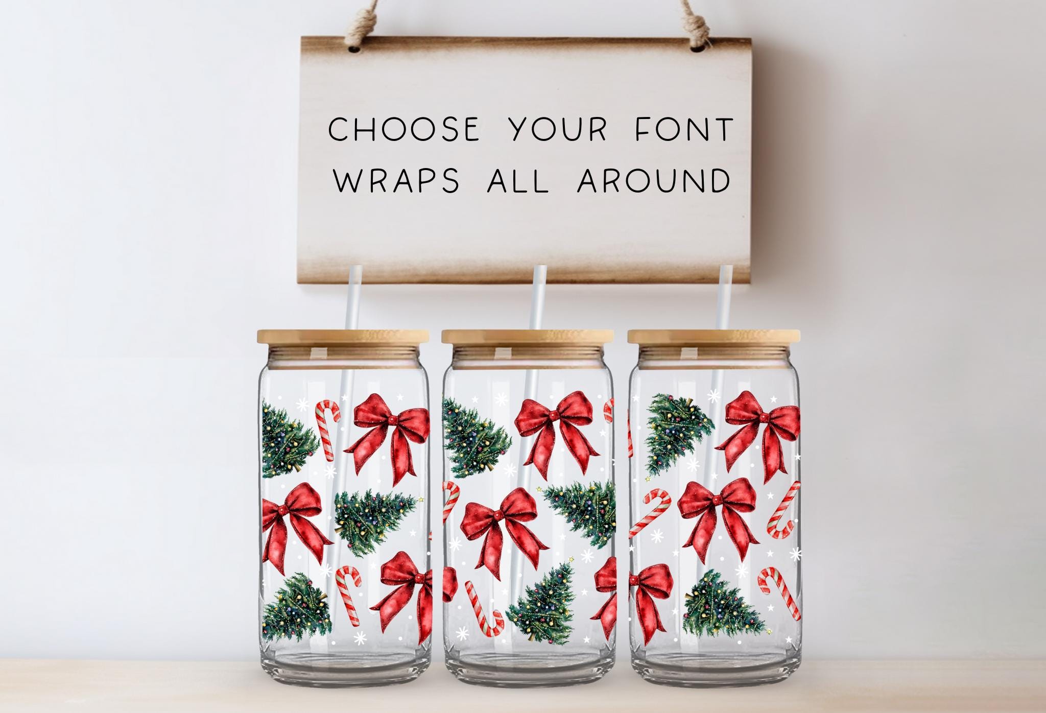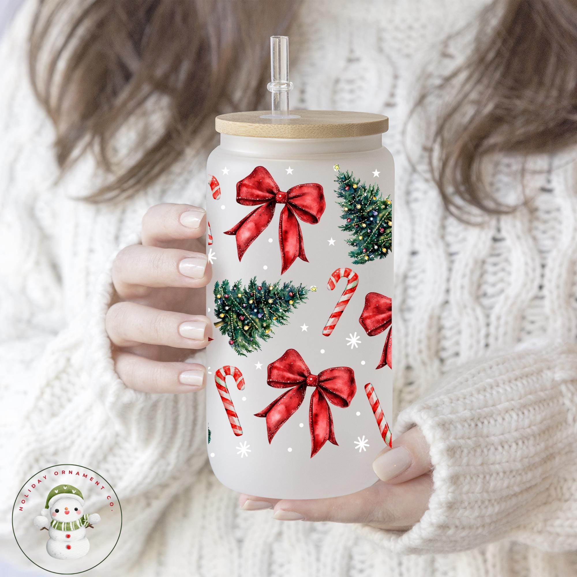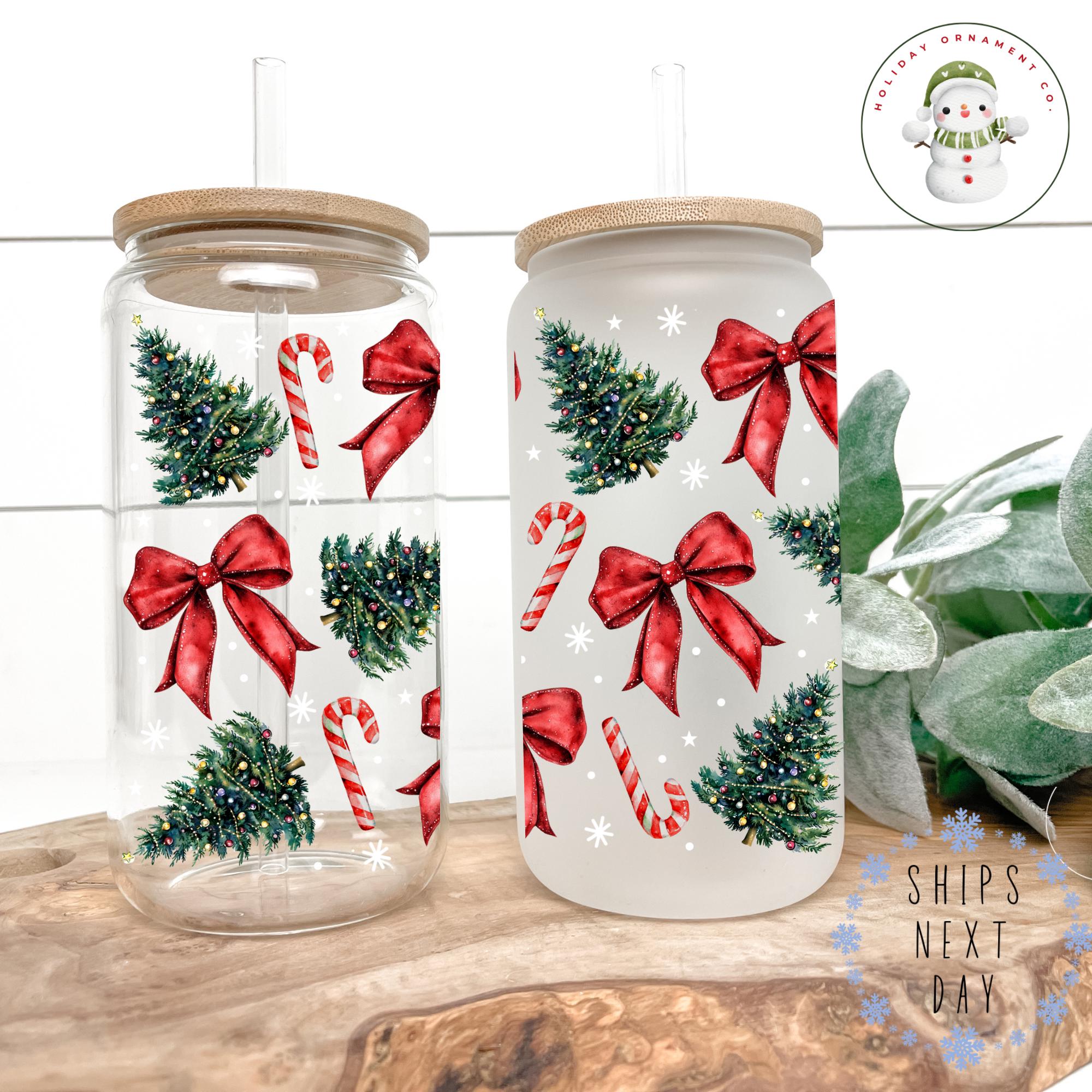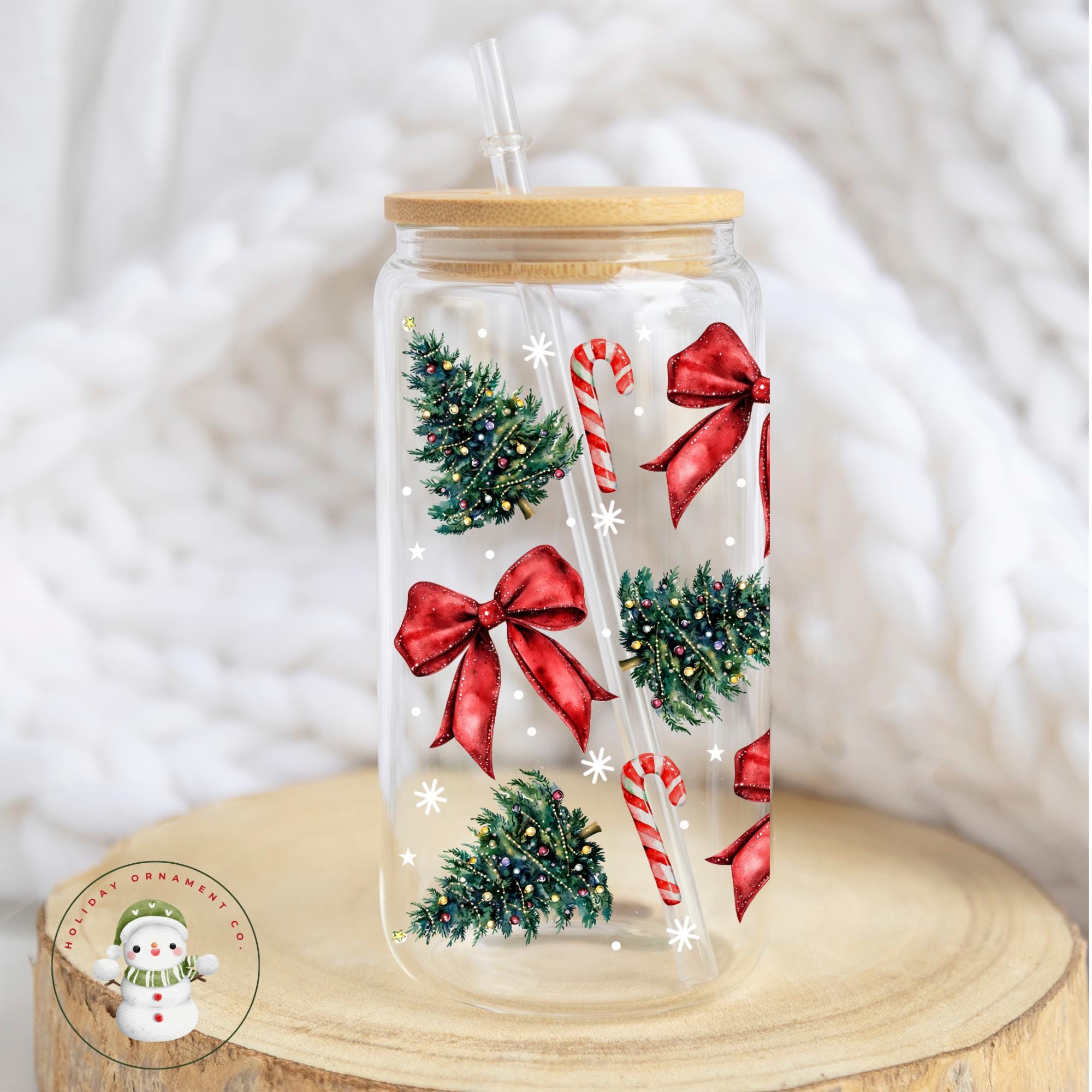 Red Bows Christmas Trees Libbey Glass Tumbler : Custom Holiday Iced Coffee Cup (16/20 oz)