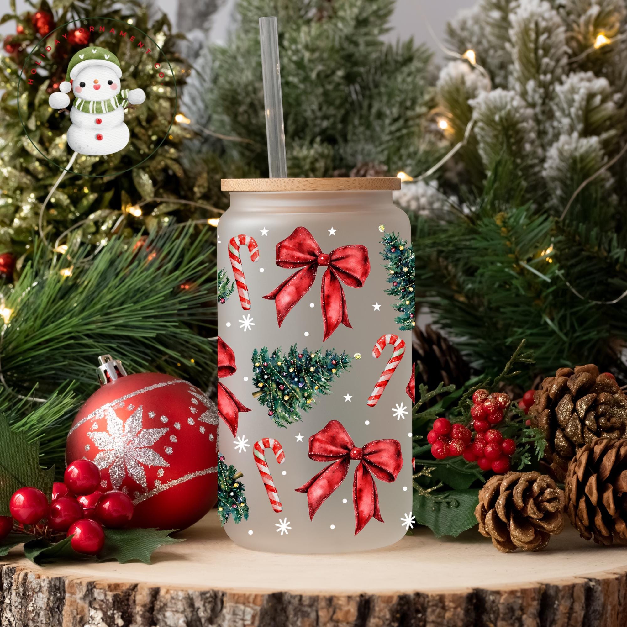 🎄This Custom designed glass tumbler cups come in 16 oz and 20 oz and have a bamboo lid and reusable glass straw.