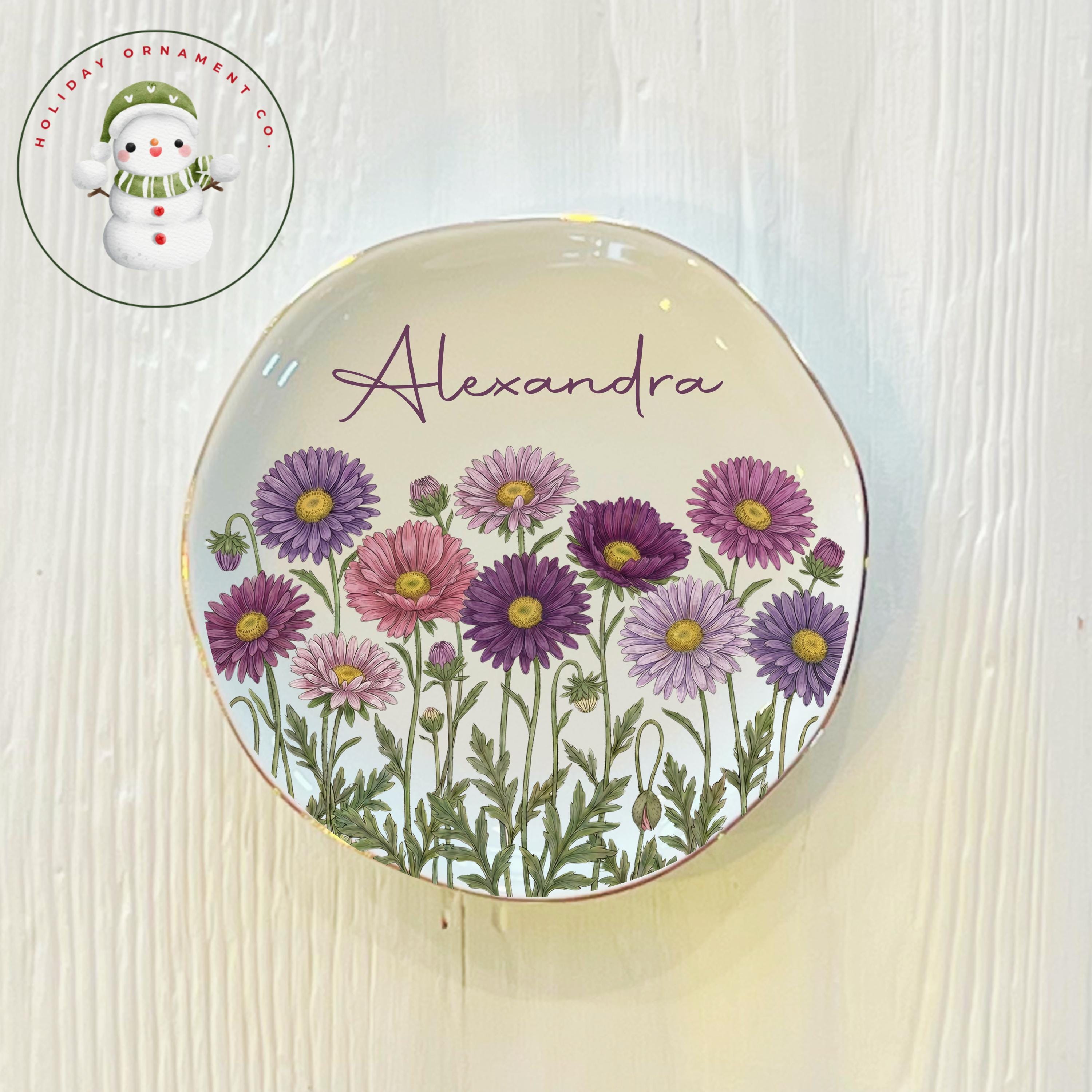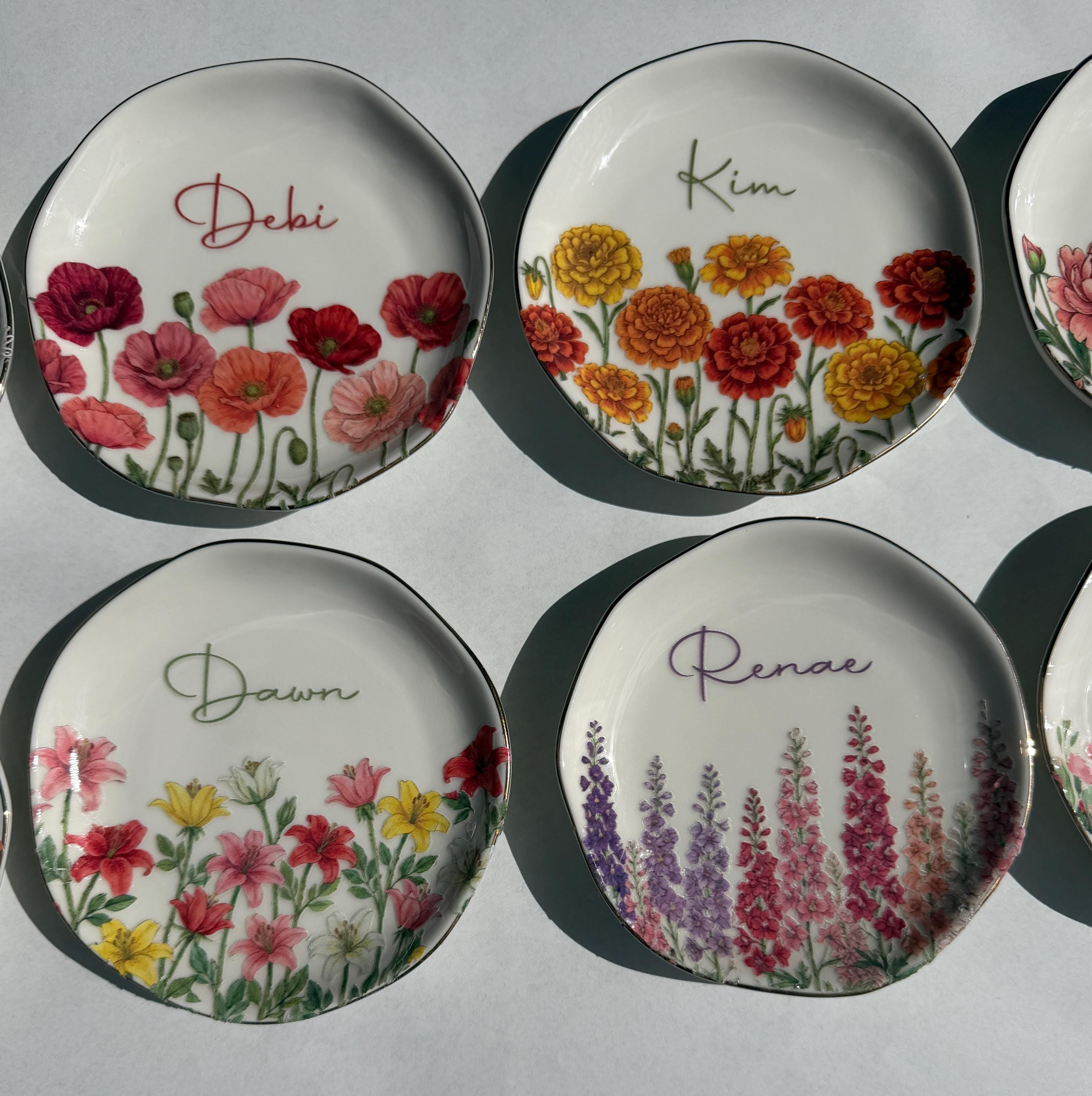 🎄This Custom designed trinket ceramic dish is beautifully crafted and personalized. It will arrive safely wrapped in its own white box. This gorgeous round ring dishes have a gold edge for that special touch. Celebrate the recipients birth month or favorite flower!
