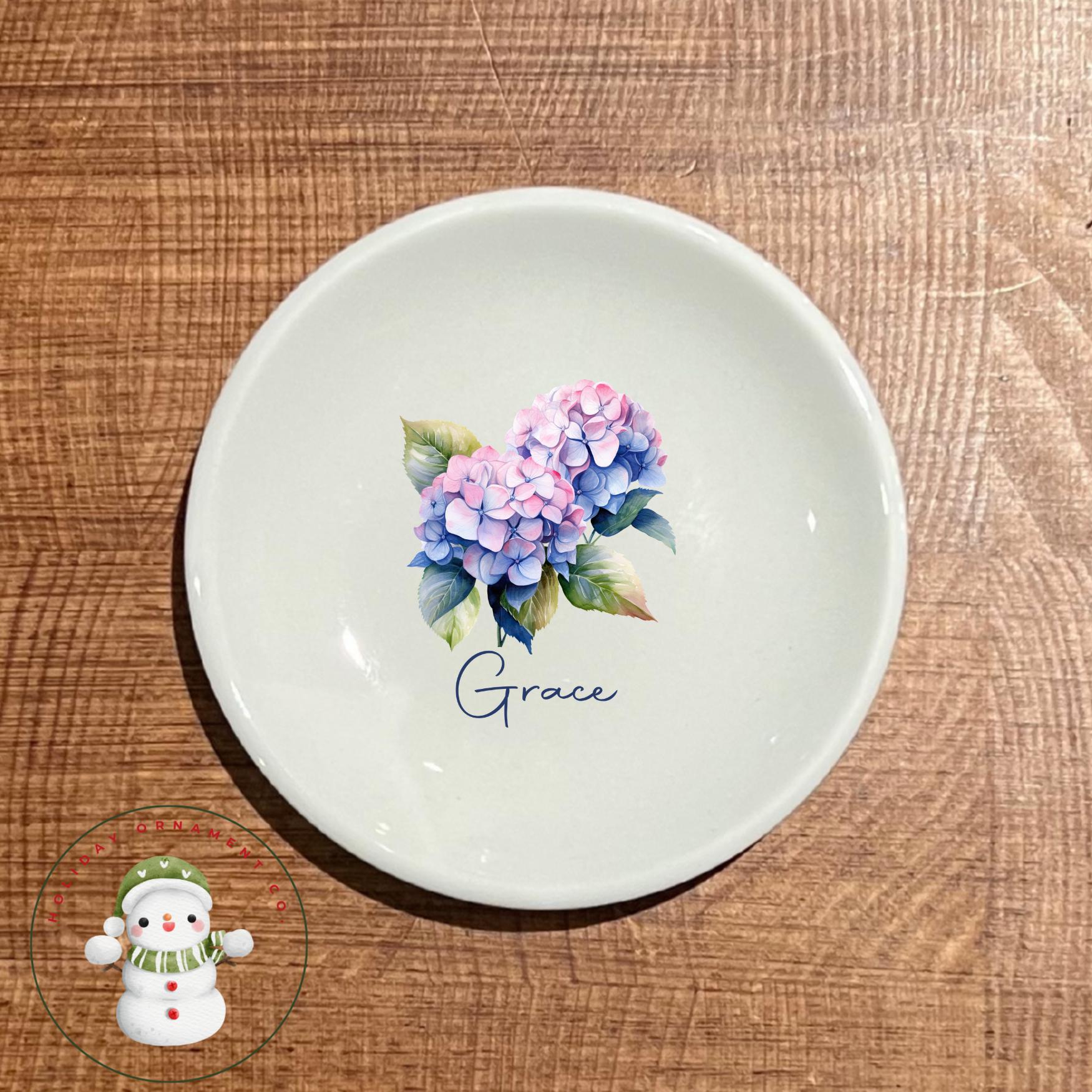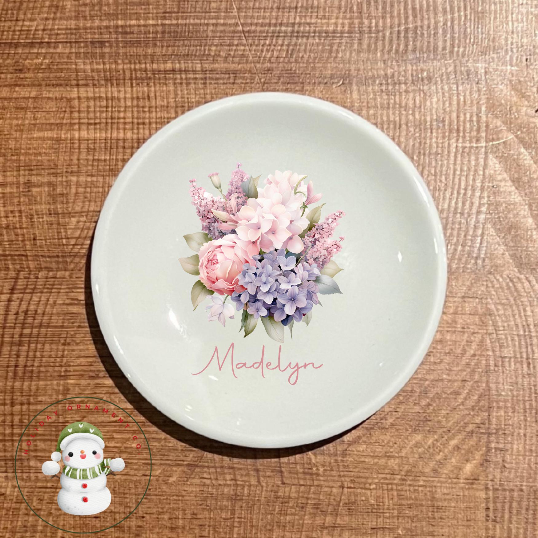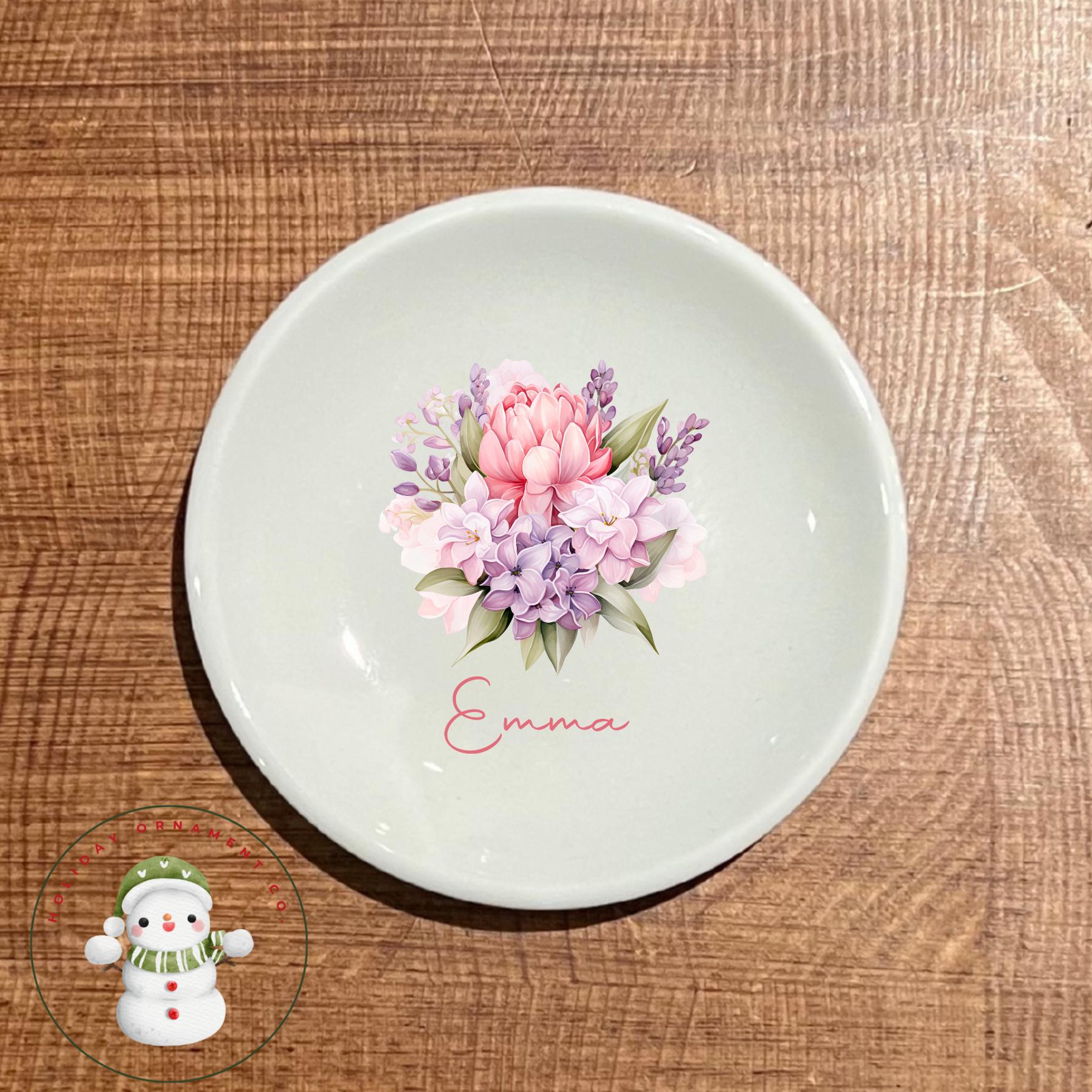 🎄This Custom designed trinket ceramic dish is beautifully crafted and personalized. These gorgeous round ring dishes have the option of 8 different designs, perfect for a shower or wedding favor! They will each come in their own organza draw string bag.